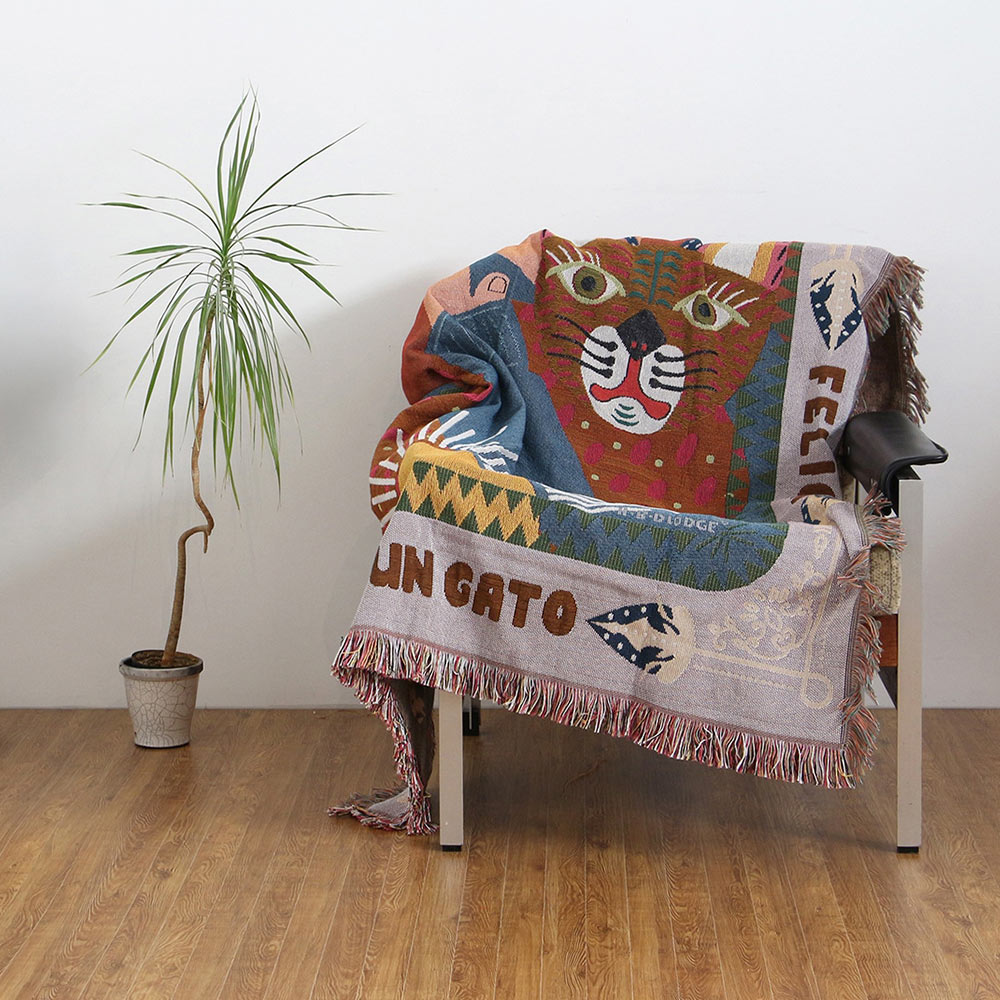 ソファやベッドにサラッと掛けて、膝掛けとして、鮮やかな色合いをいかしてアートとして壁面への装飾として斬新な使い方など様々にお部屋を彩ります。