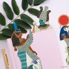 オシリス、ホルス、ラーなど象徴的な神々が描かれ、神秘的な古代文明の世界観を感じられます。 古代エジプト神話には多くの神々が存在し、それぞれ自然や生命、王権などを司る存在として信仰されてきました。人と動物を組み合わせた象徴的な姿は、壮大な神話の物語を今に伝えています。
