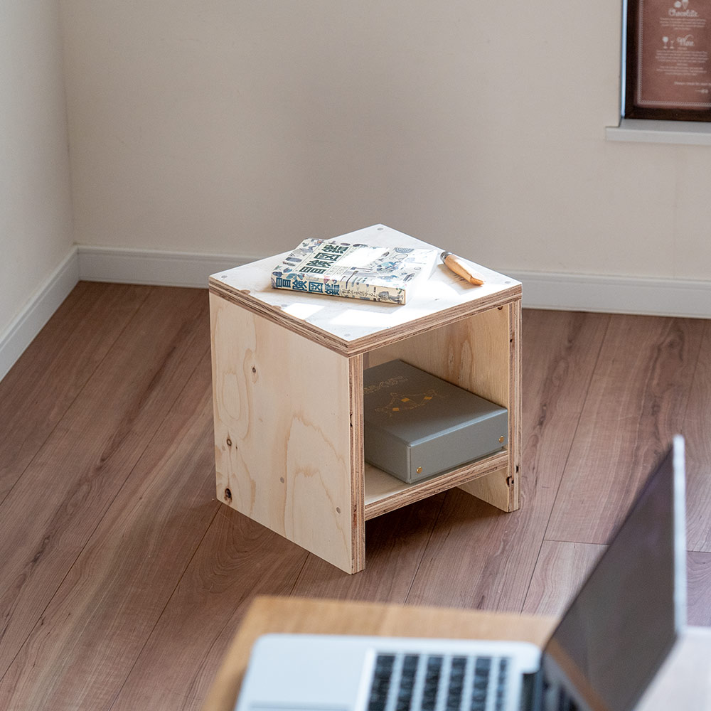 まるで図工室にありそうな素朴な四角い木のスツール。