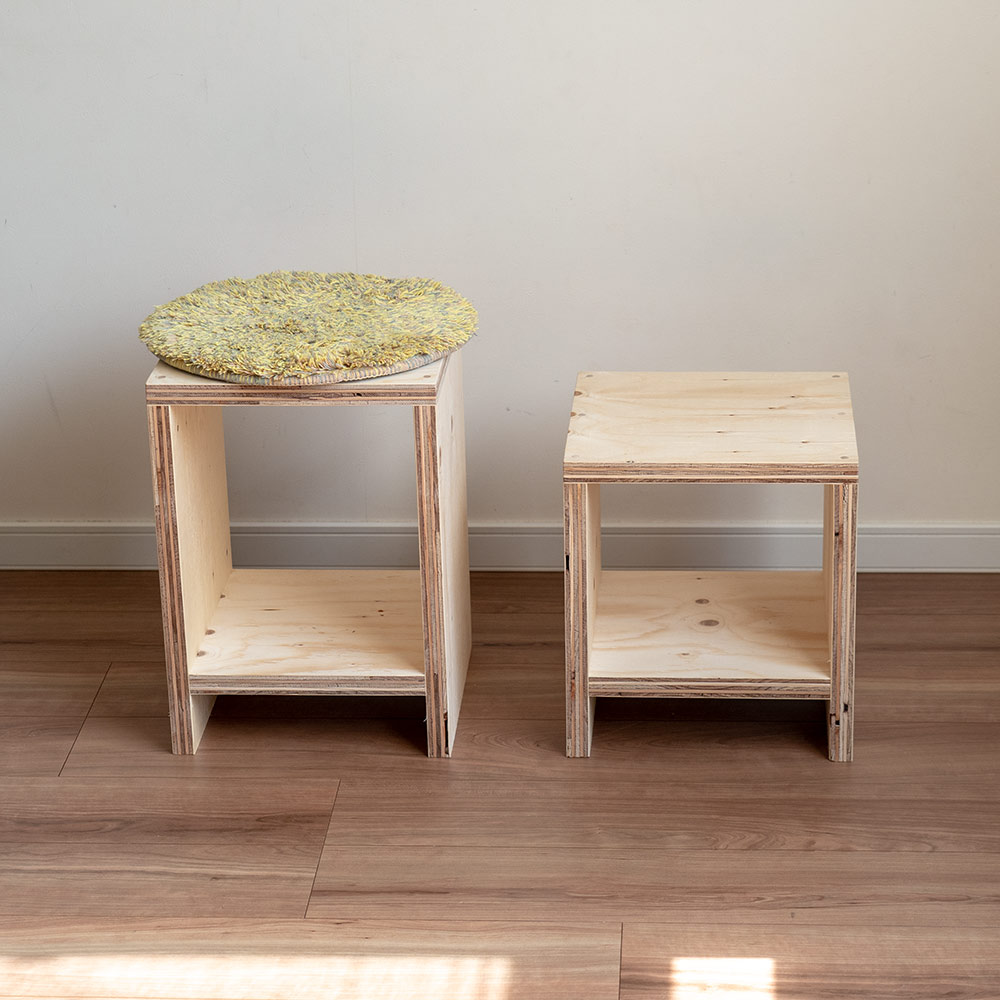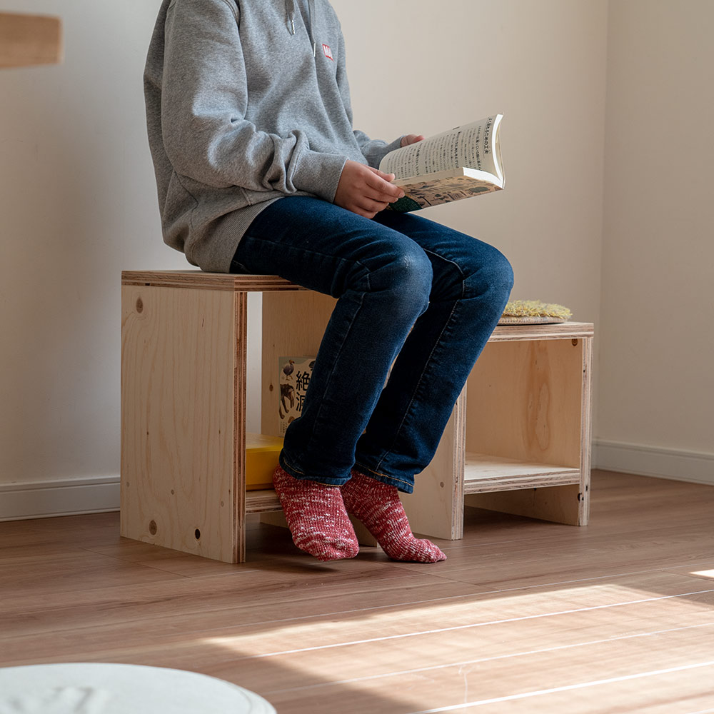 イエノLabo.オリジナルのスツールより、座面の奥行きアップ&棚板付きの新タイプが仲間入りしました。