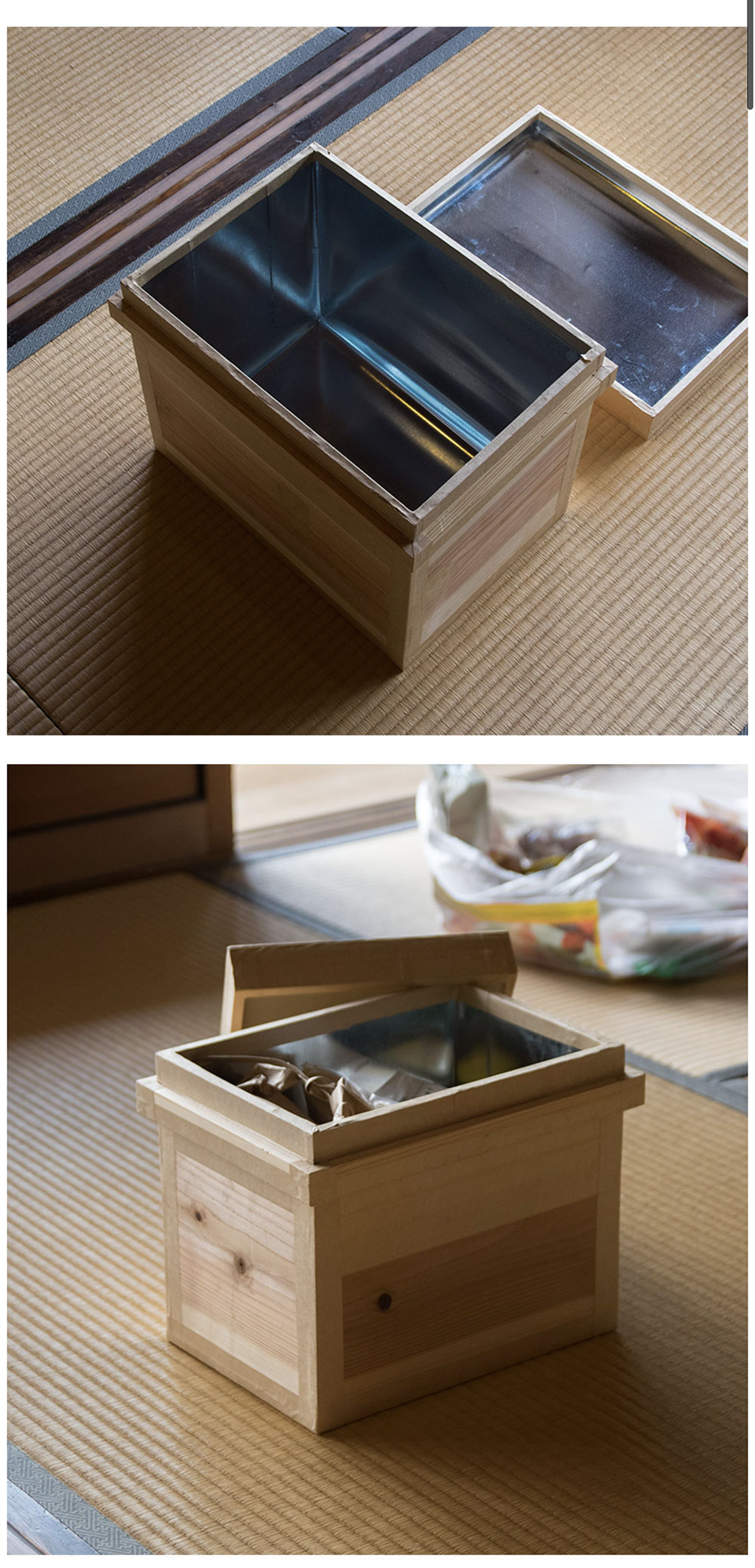 材質は静岡県産の杉材を使用、内側には隙間なく亜鉛鉄板を張り付けているので、外部からの湿気やニオイを防ぎます。
