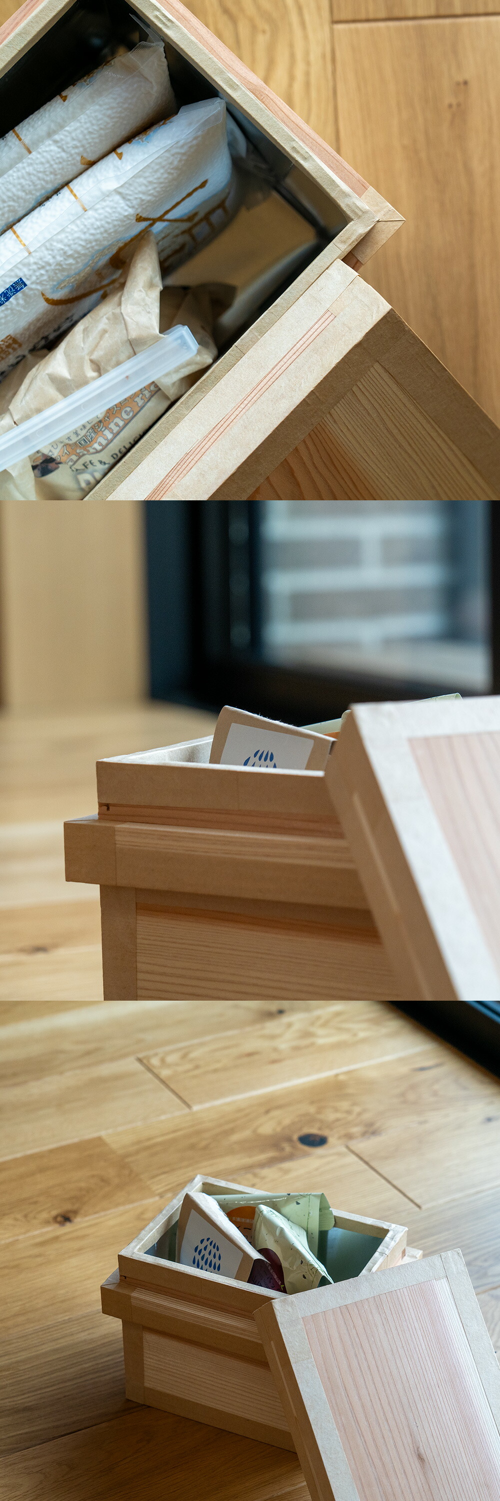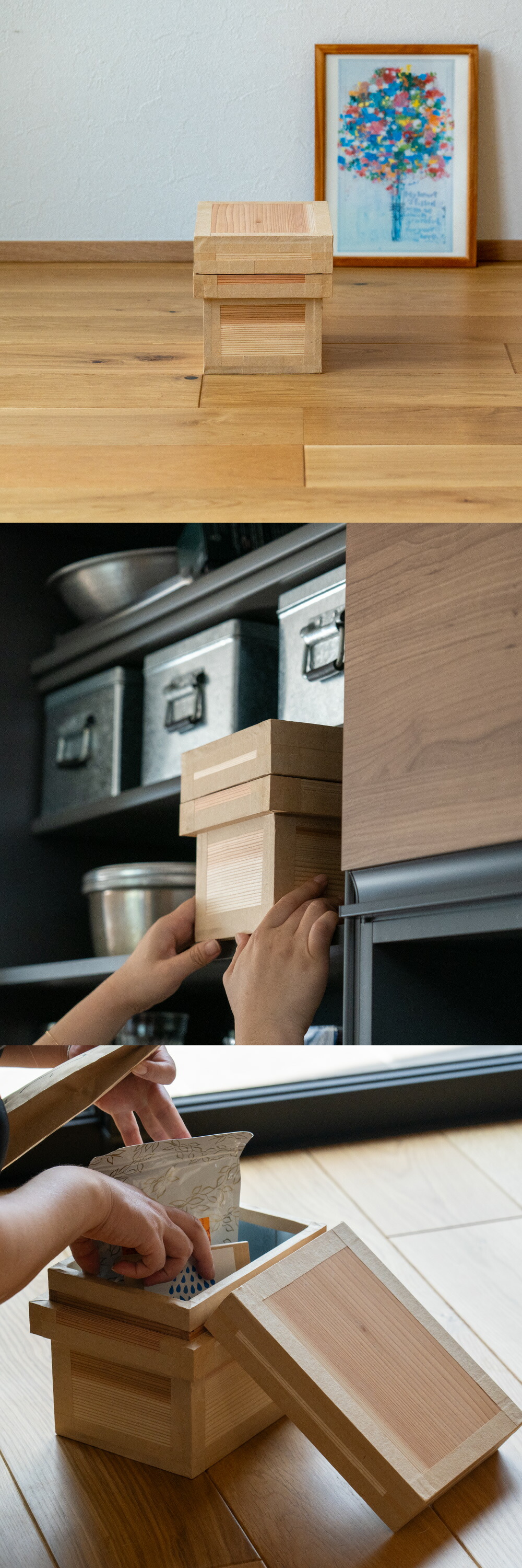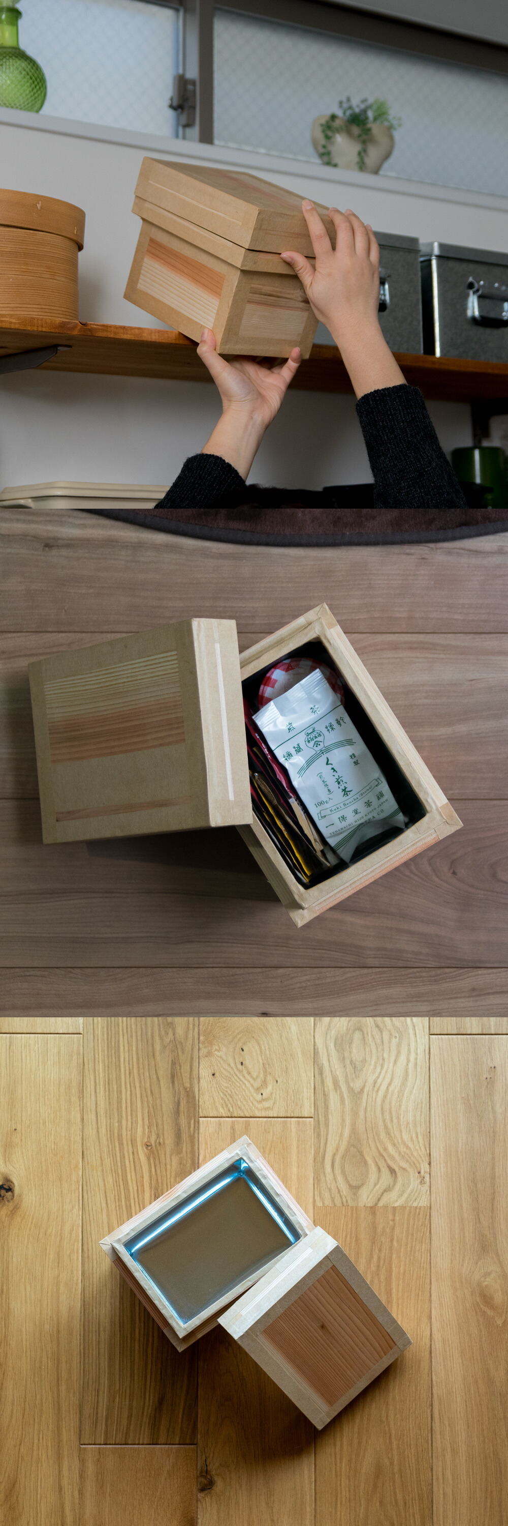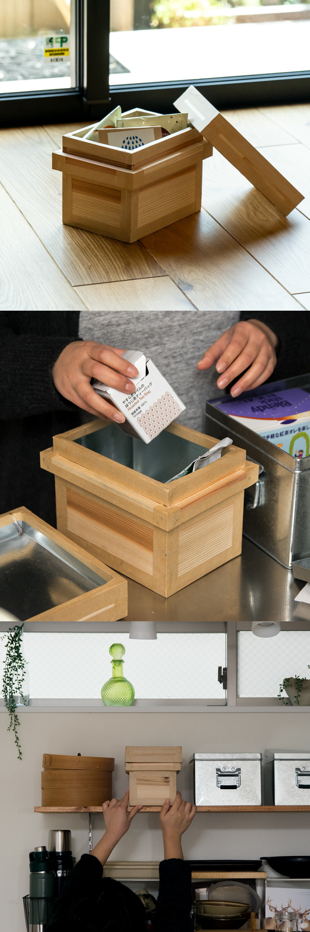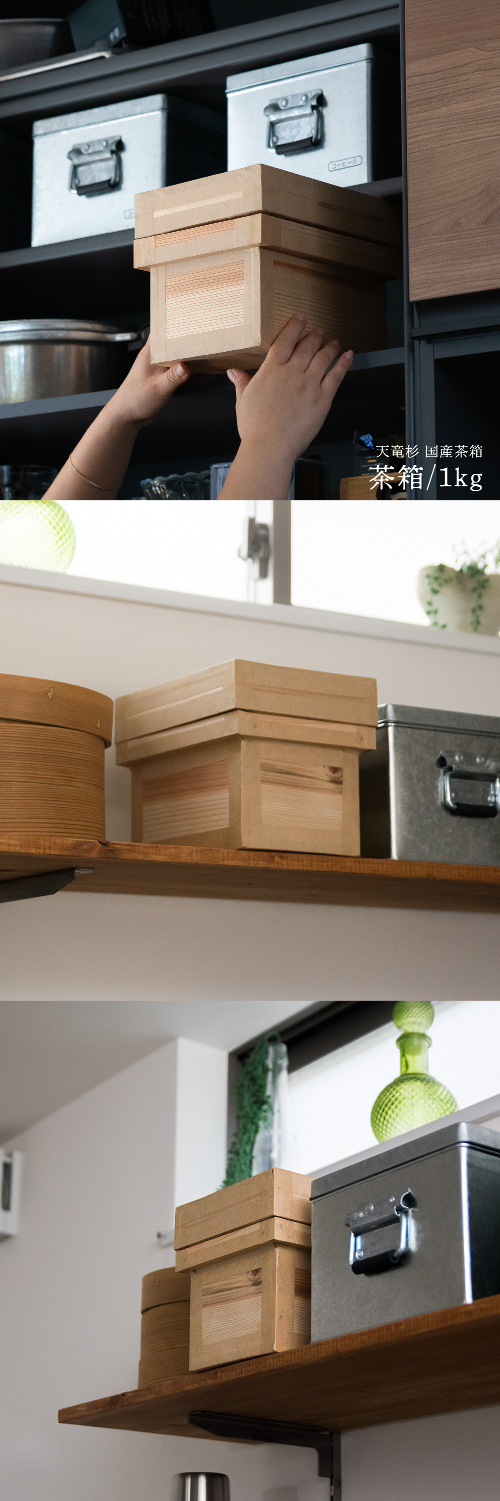 お茶の保管や輸送に使われてた昔ながらの茶箱は防虫・防湿効果も高く、お米や乾物、衣類、思い出の品まで、大切なものをしっかり守ります。