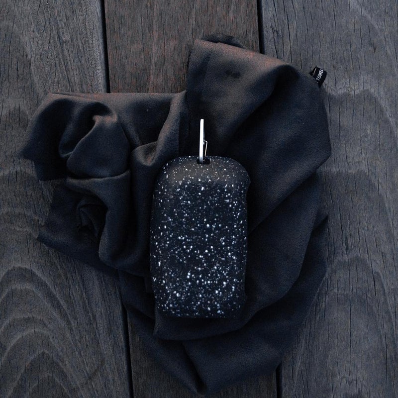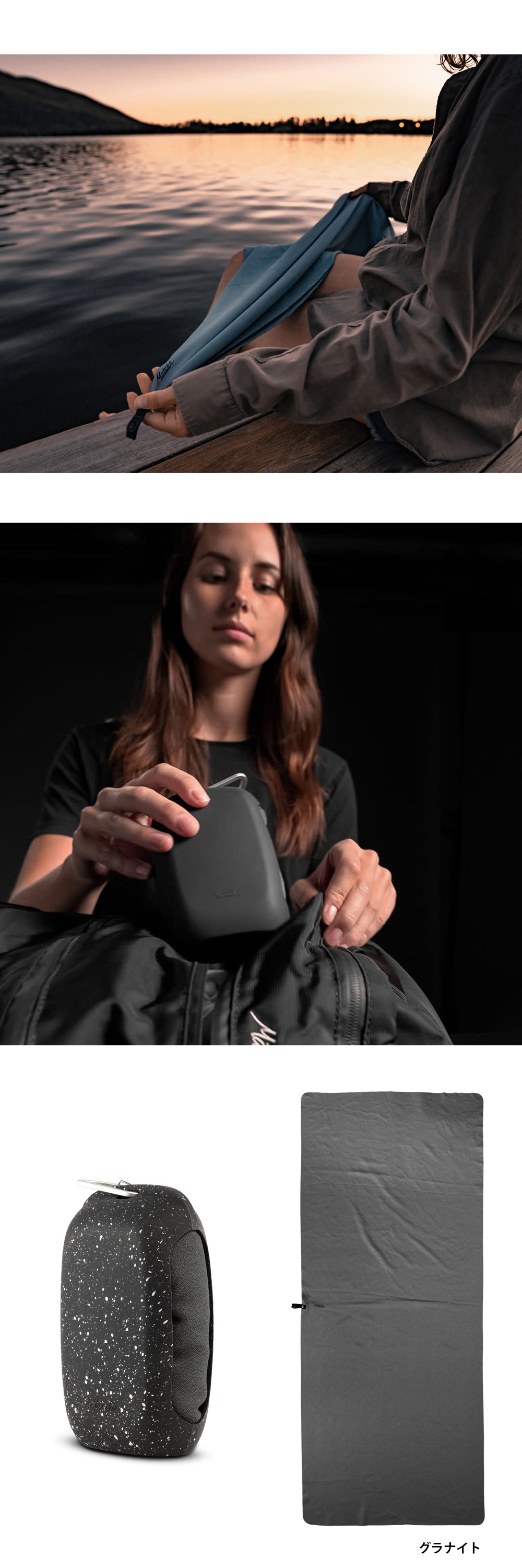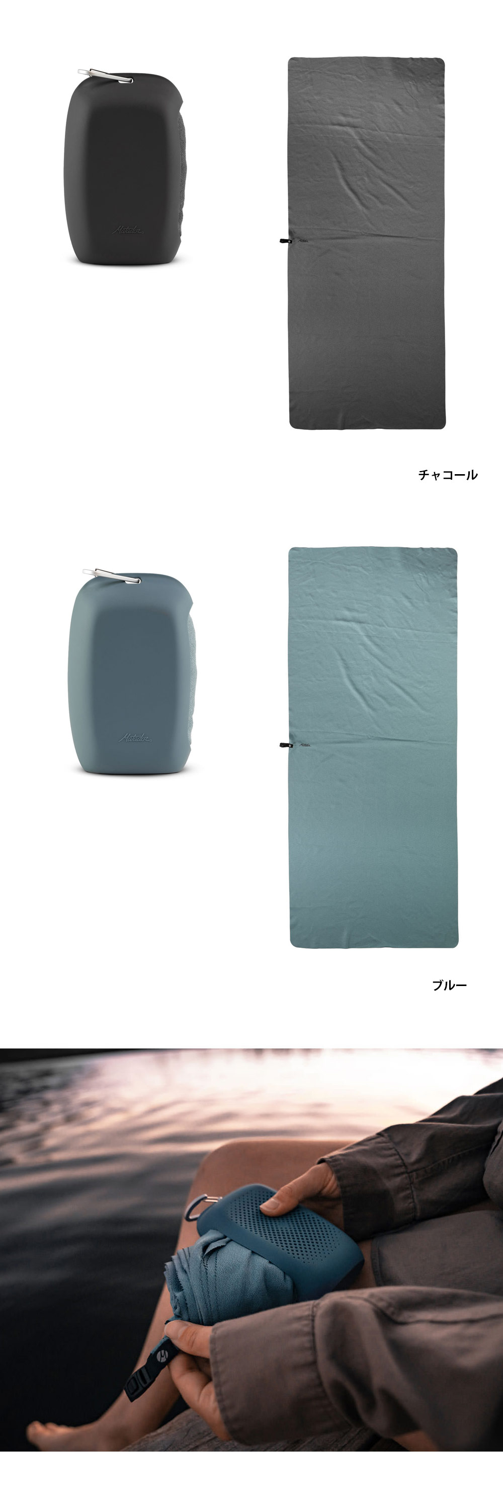 自重の2~3 倍の吸水性があり、速乾性の高いナノファイバーを使用しています。付属のシリコンケースにはカラビナが付いているので、未使用時はパックに取り付けておくことも可能です。
