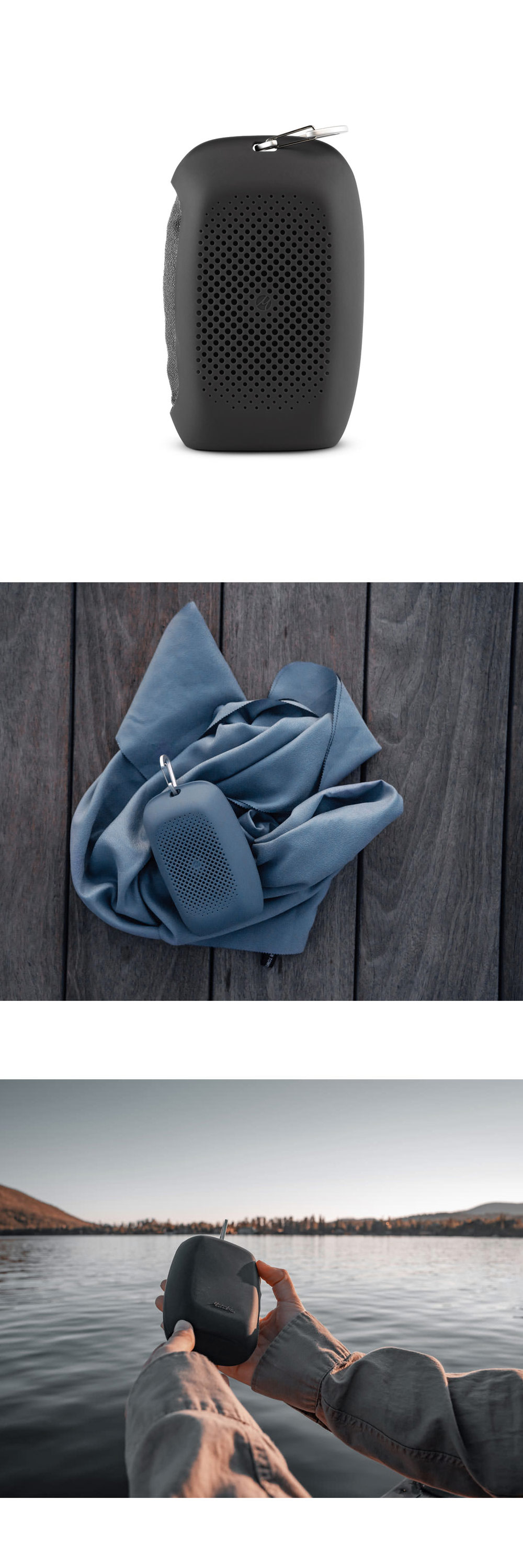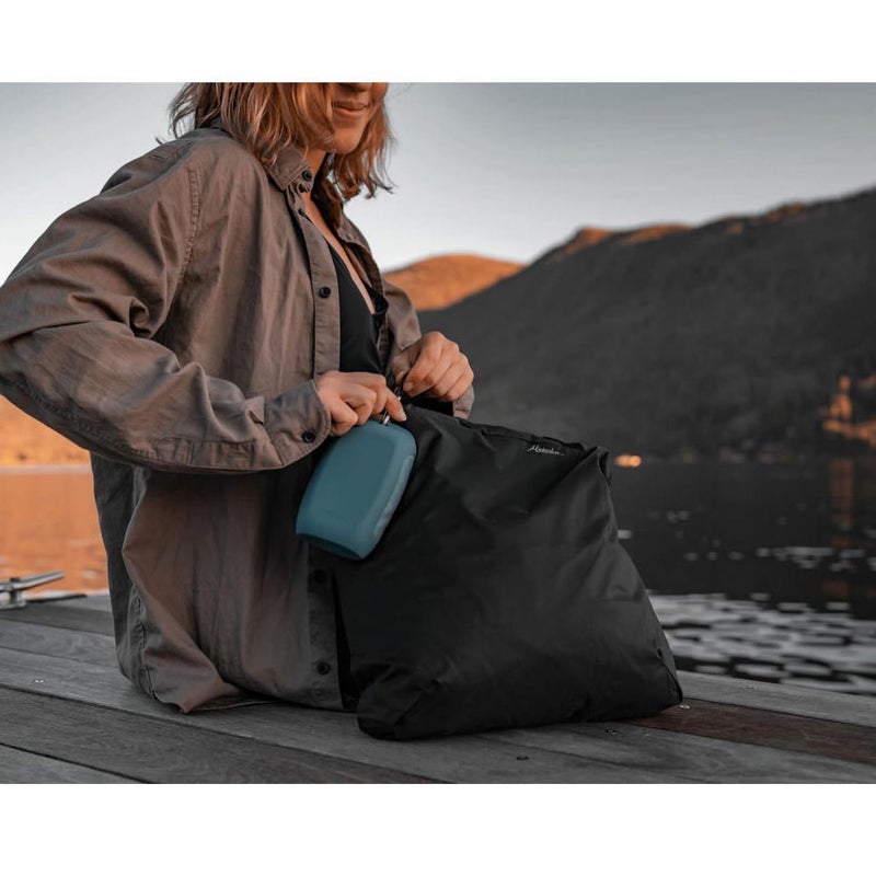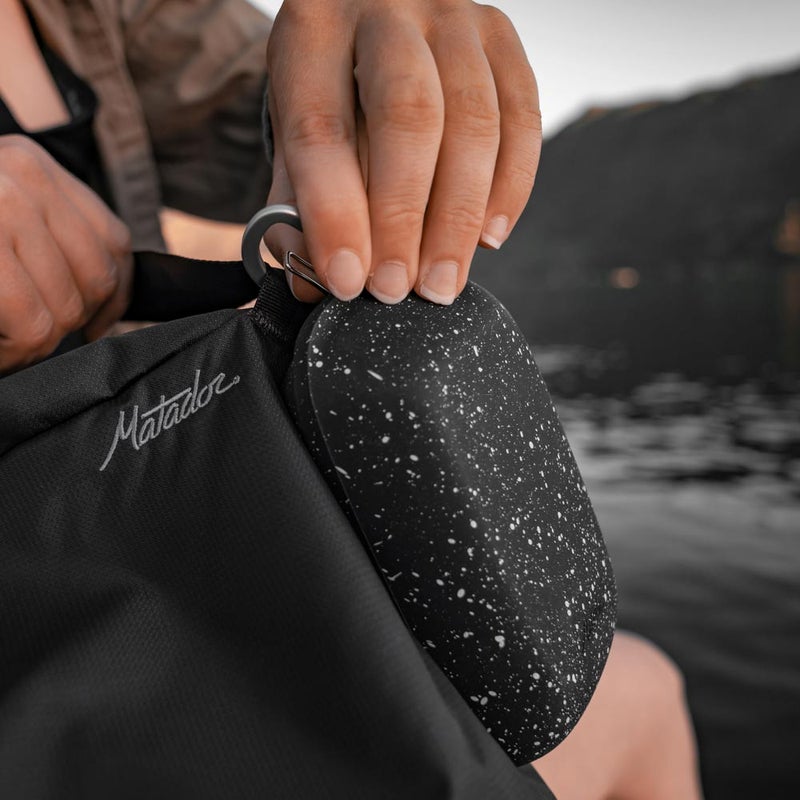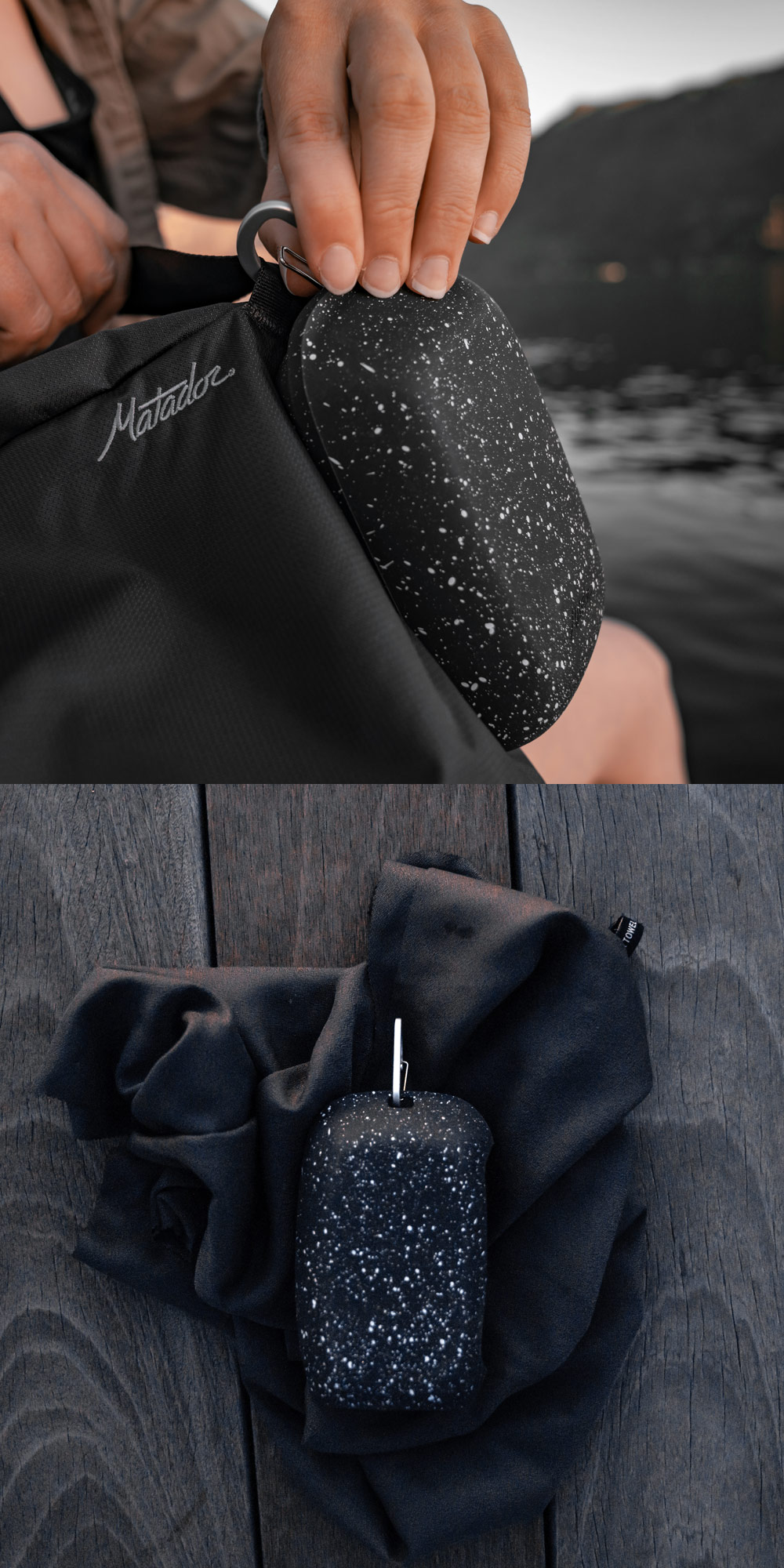 自重の2~3 倍の吸水性があり、速乾性の高いナノファイバーを使用しています。付属のシリコンケースにはカラビナが付いているので、未使用時はパックに取り付けておくことも可能です。