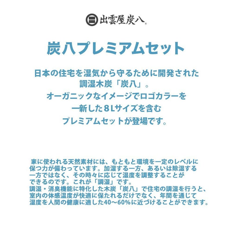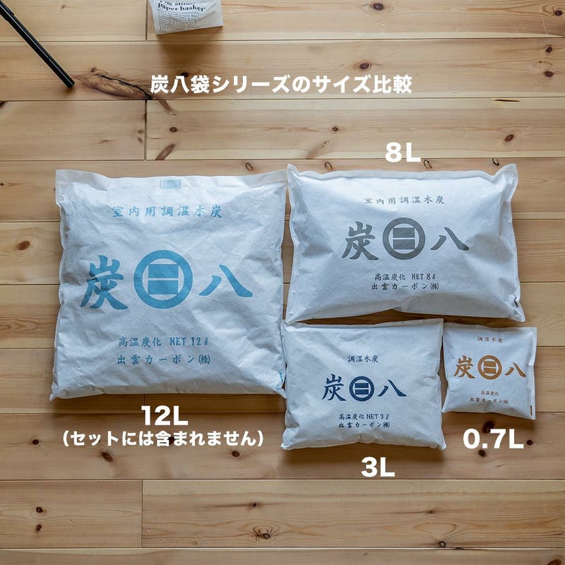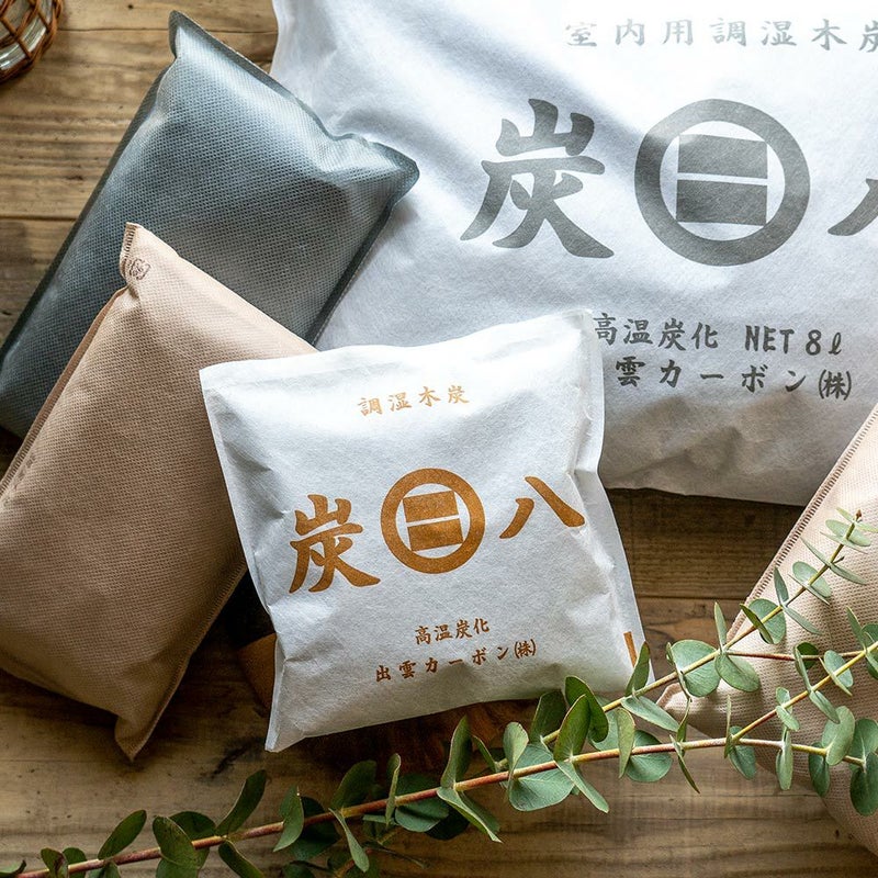 8L分の炭がギュッと詰めこまれているので調湿効果もしっかりと、形が崩れにくい形状であらゆる場所でお使いいただけます。