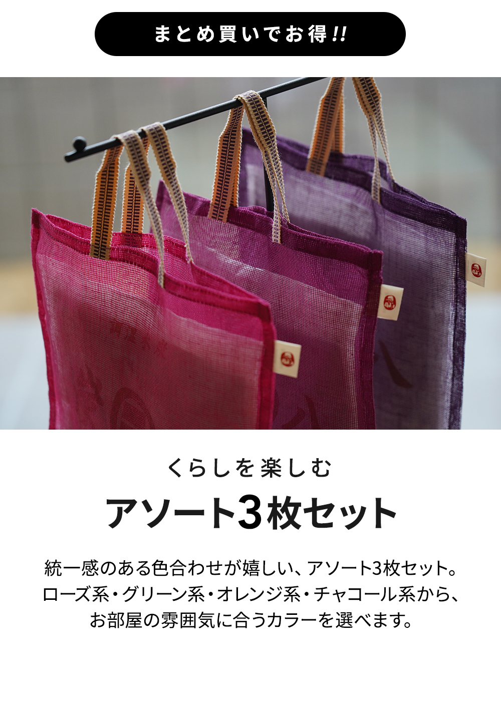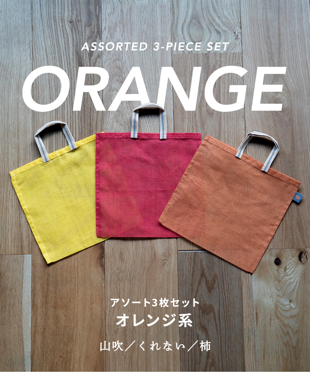 炭八:ベージュ3袋セット、かや袋:オレンジ系アソート3枚セット