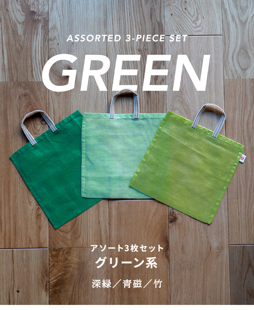 炭八:ベージュ3袋セット、かや袋:グリーン系アソート3枚セット