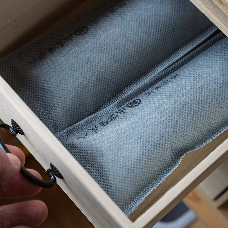 クローゼットに吊るしたり、そのまま靴箱や棚、引き出しに忍ばせたり。炭八のカラーは“ロゴが入ったホワイト”と、“ロゴが目立たないベージュ”の2色から選べます。
