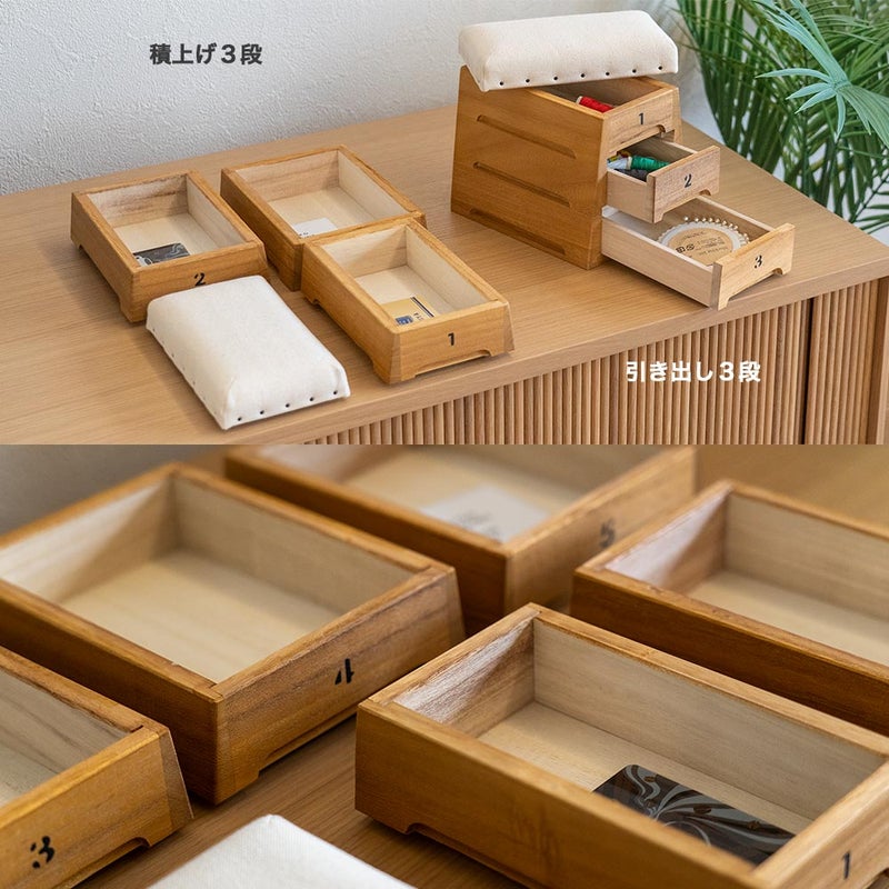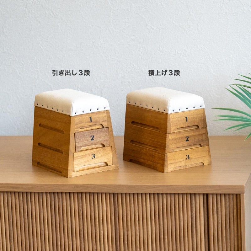 本物の跳び箱と同じ「積上げ」と、卓上収納に便利な「引き出し」の2種類。