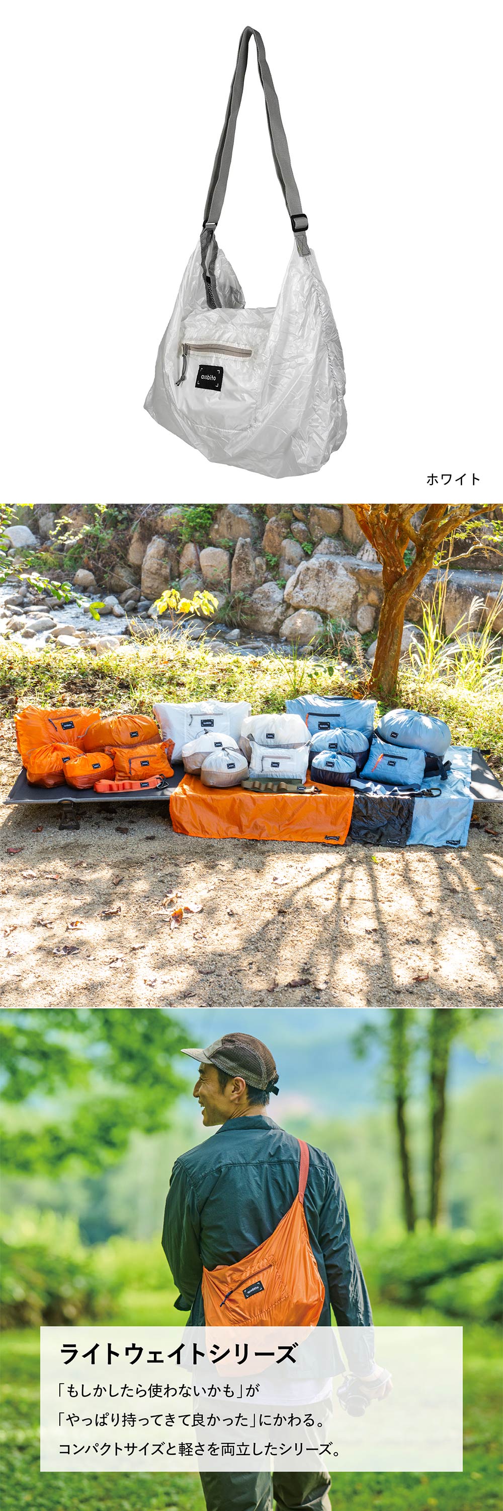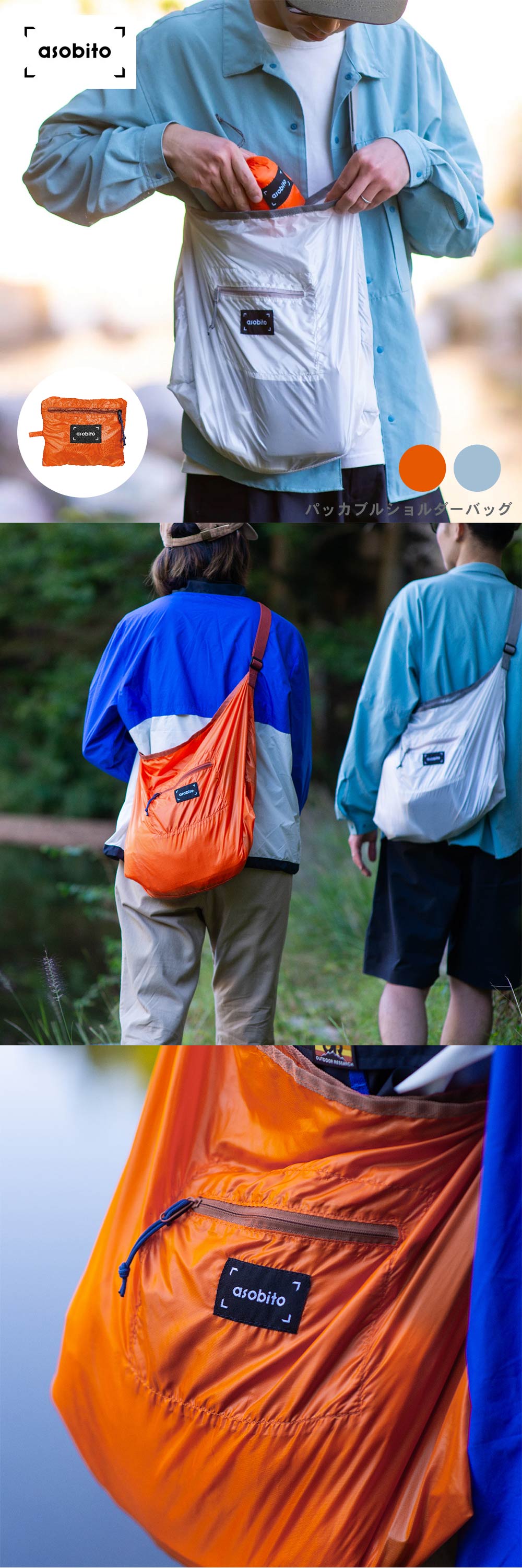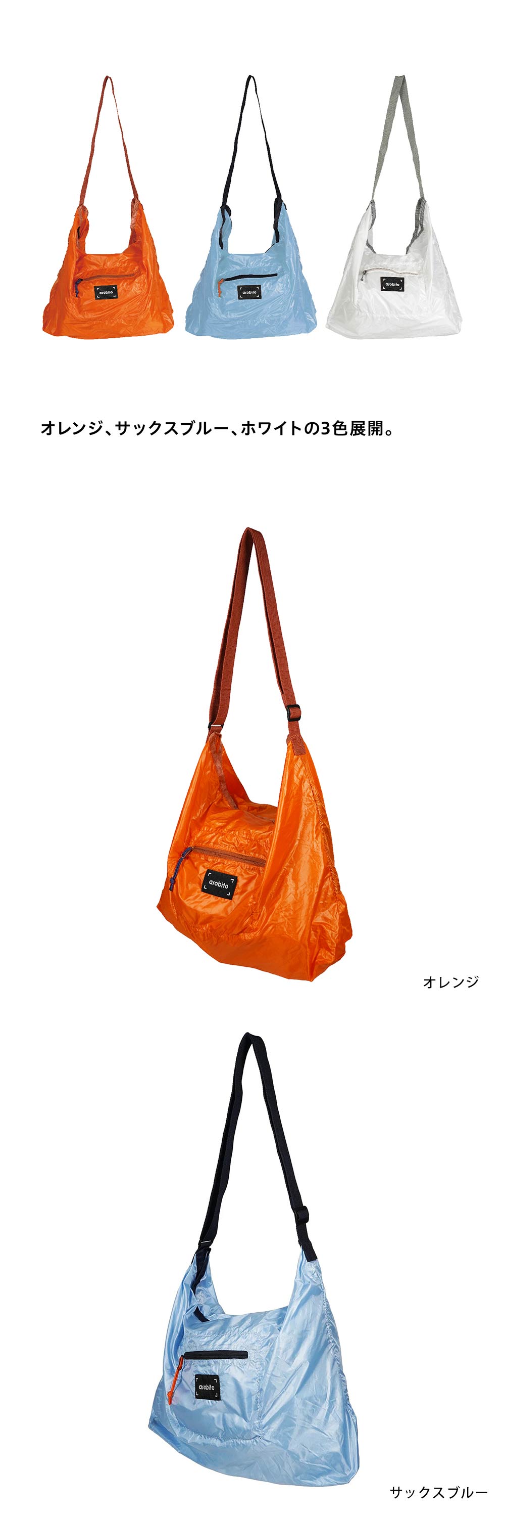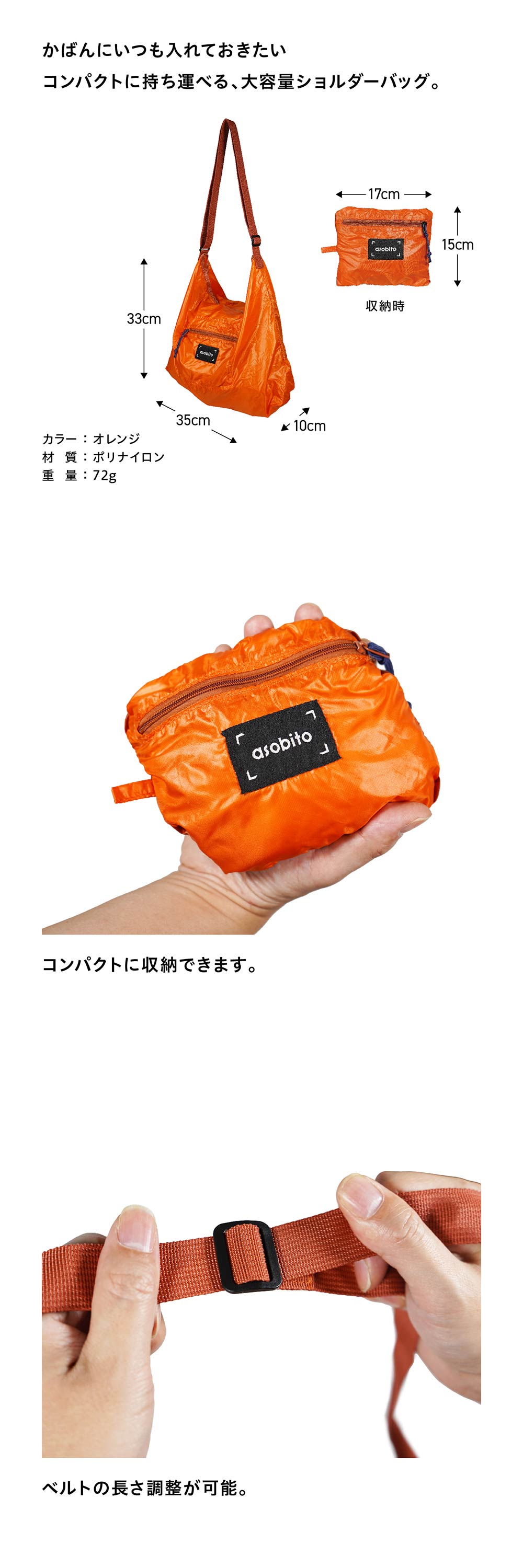 わずか72gの軽量ショルダーバッグ コンパクトに持ち運べる、大容量仕様 asobito|パッカブルショルダーバッグ