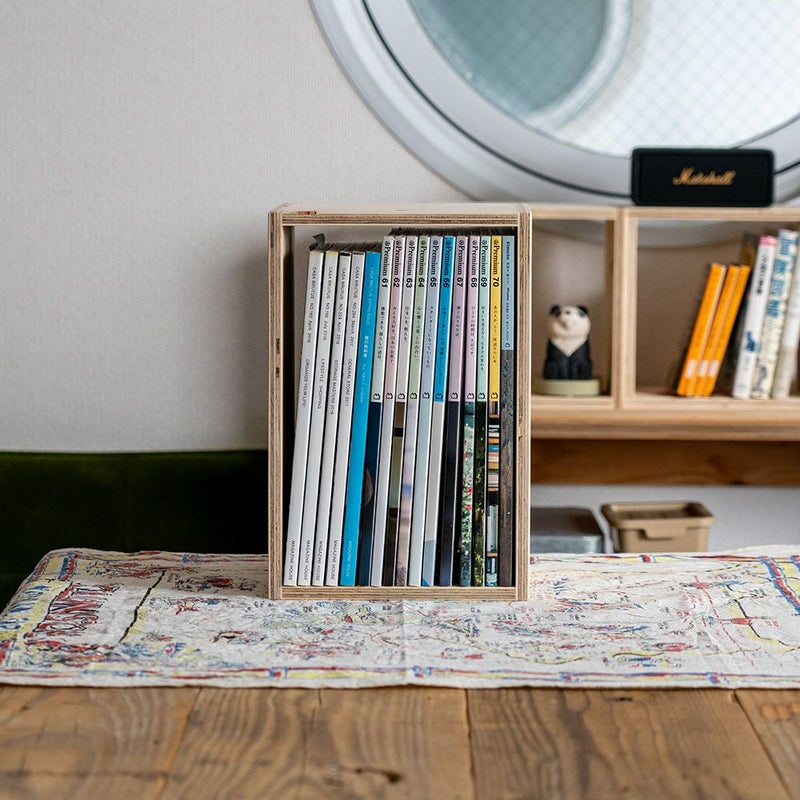 雑誌やA4サイズの物はシェルフを縦にして収納、文庫本やマンガなどは横置きでスッキリと納まります。