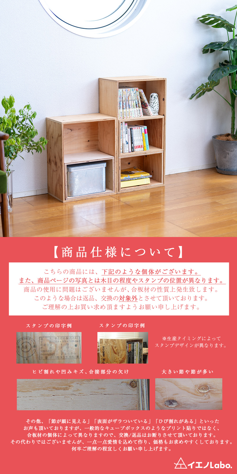 合板材の性質上、印字スタンプ・割れ・欠け・節などが目立つ場所に入る場合があります。