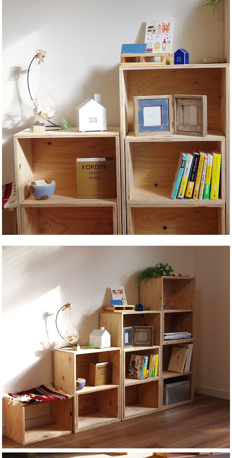 収納が欲しい場所に応じて、タテ・ヨコ自由にレイアウトできるシェルフボックス。リビングや寝室、書斎に玄関…ラフな木の質感で家中どこでもお使いいただけます。