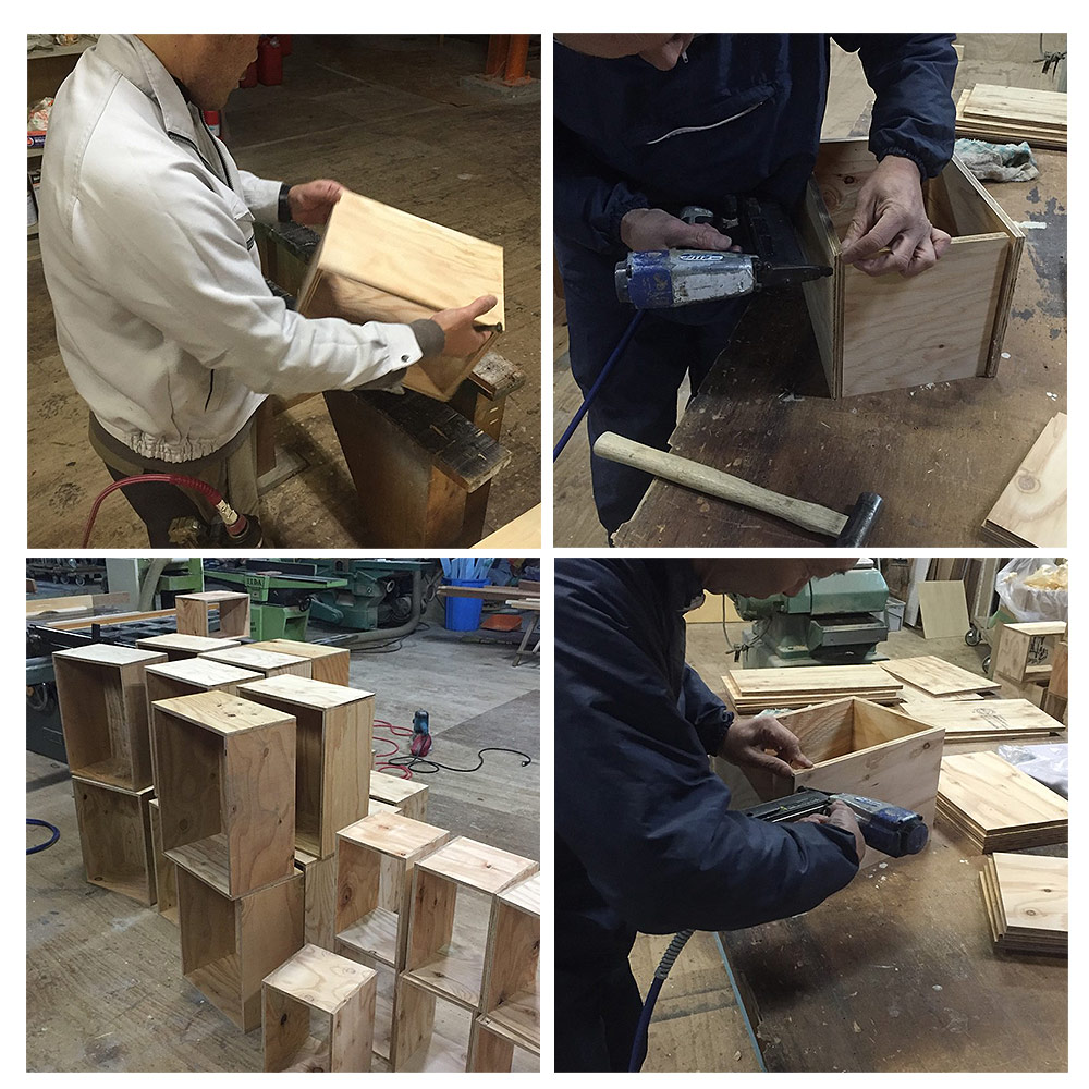 OSBには、木に細かな凸凹を付けて、パズルのように組み上げた「あられ組」という製法でお作りしております。