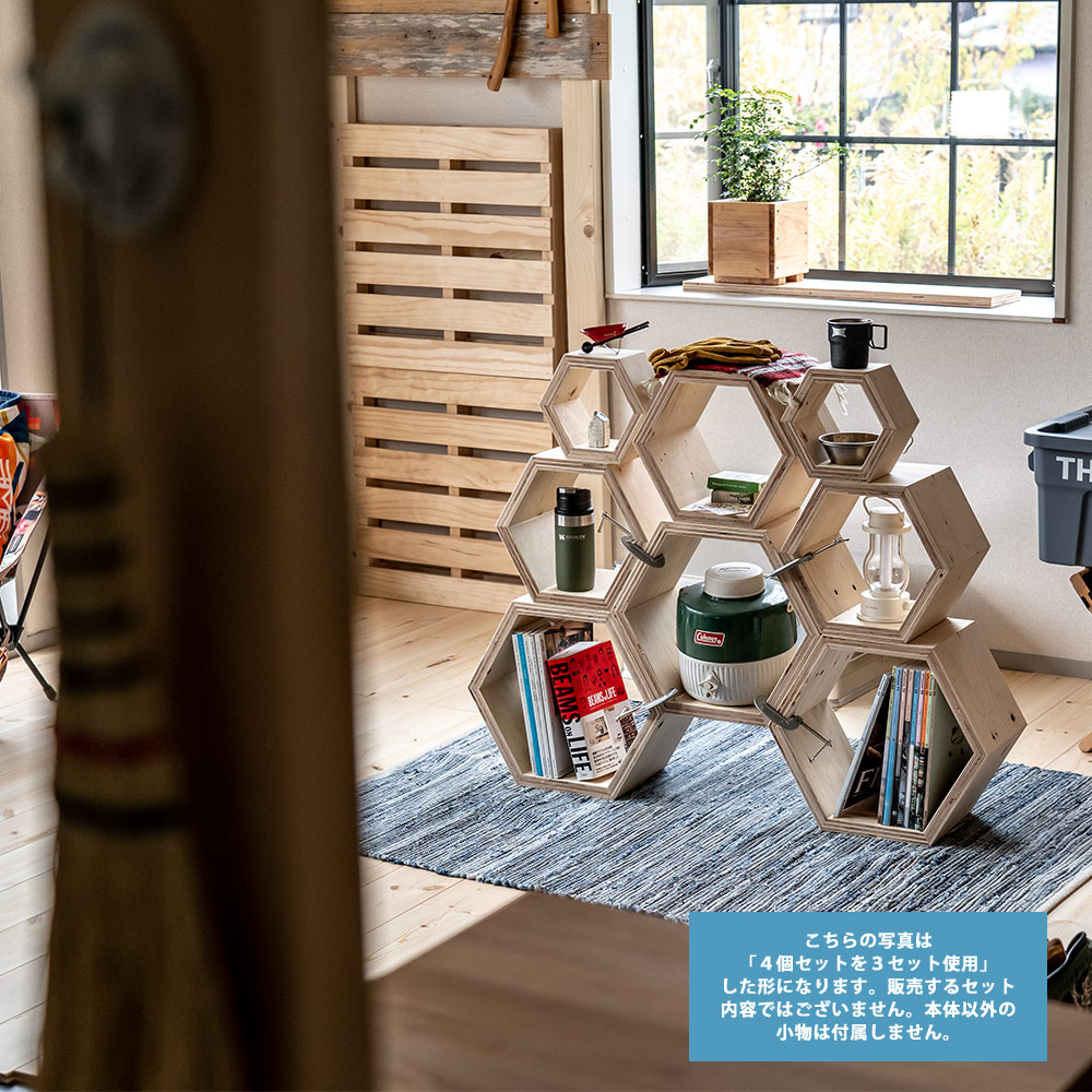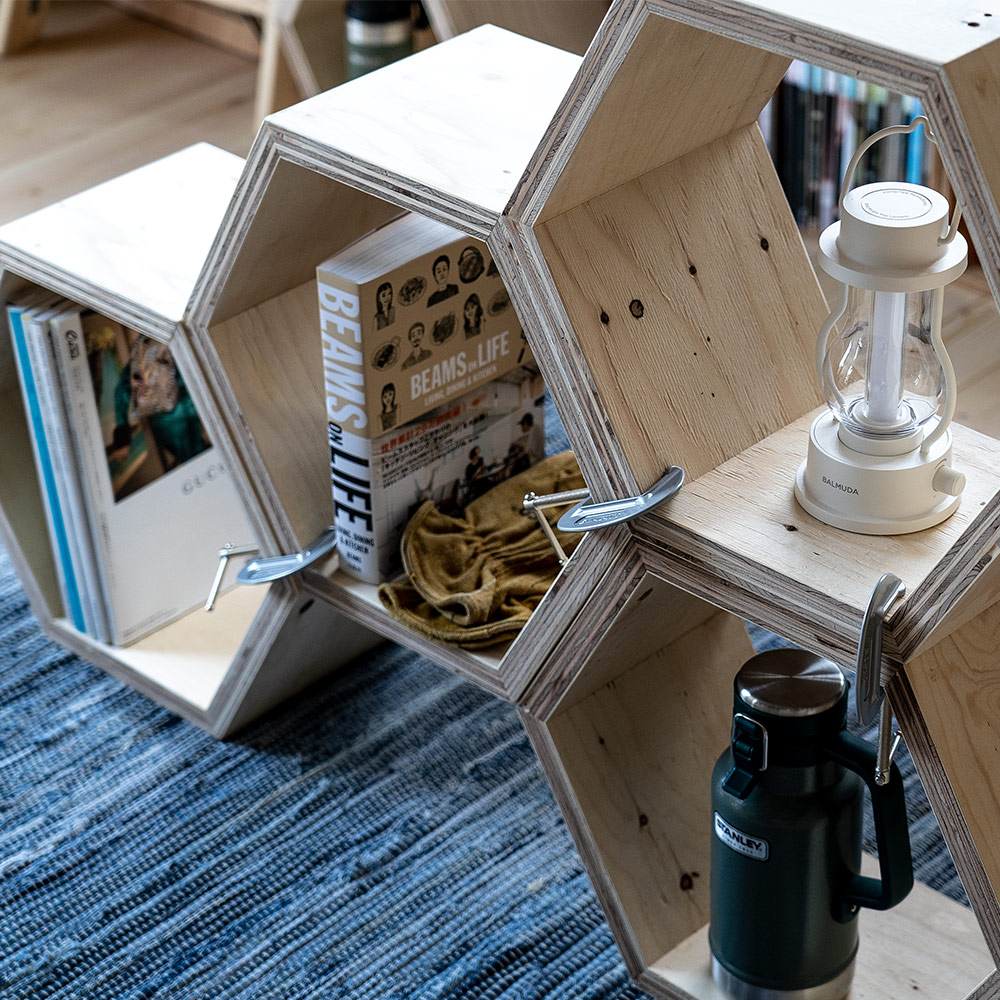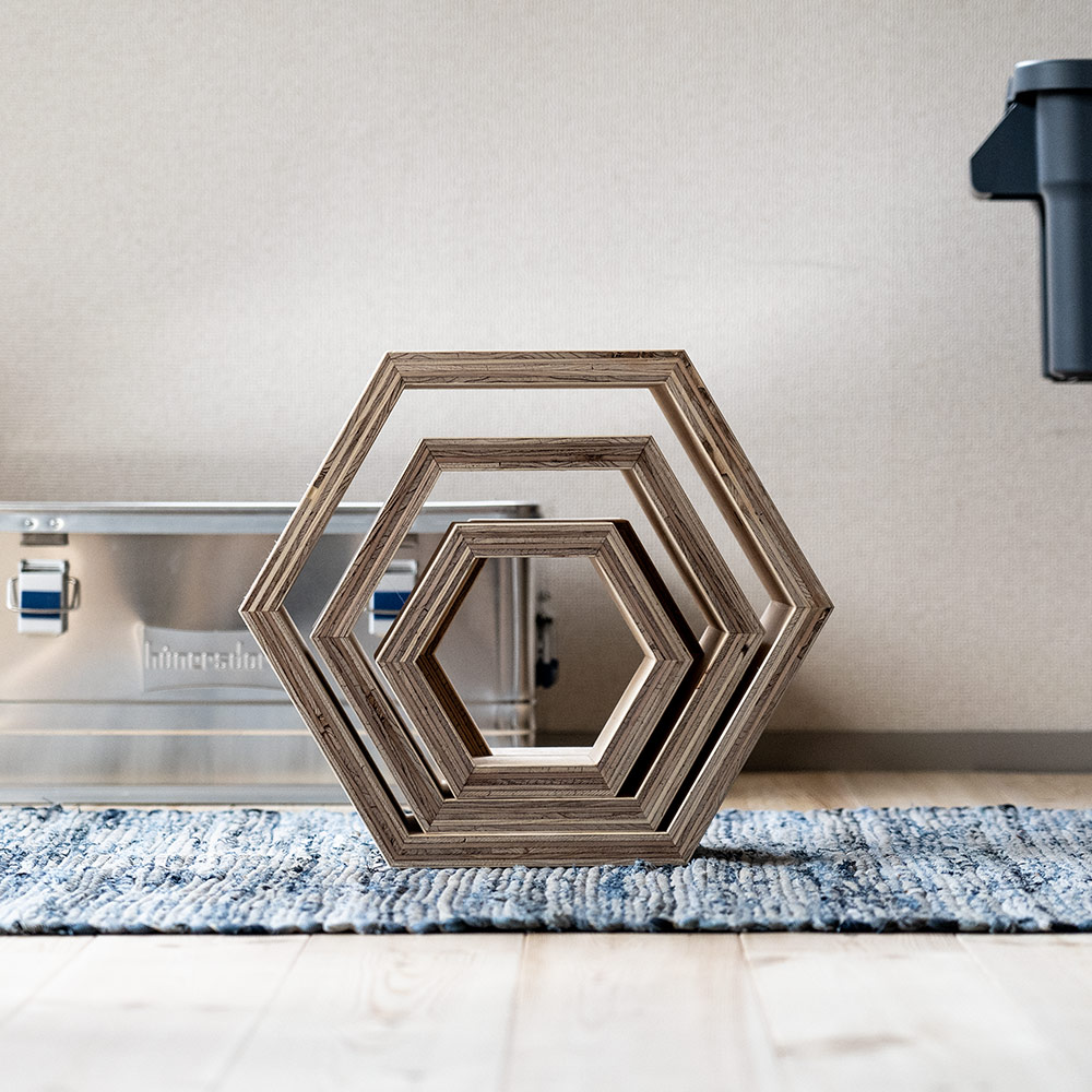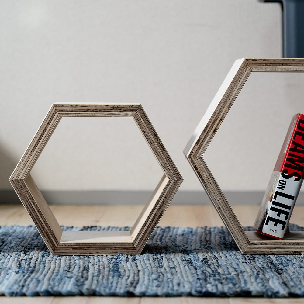 イエノLabo.オリジナル木の収納シリーズに、ユニークな六角形型のシェルフが仲間入り。