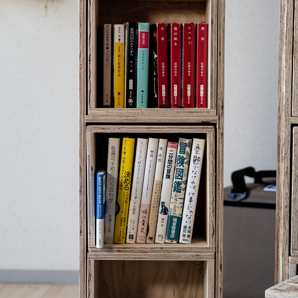 キューブ型子箱を中に入れて使うと、間仕切りやブックエンド代わりにもなります。コミックや文庫本にちょうどいいサイズで作りました。