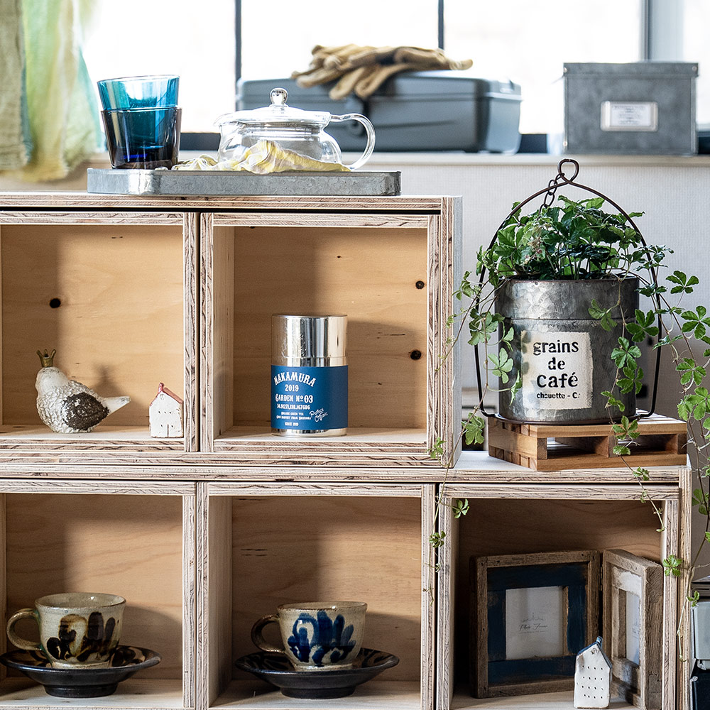 自由にレイアウトが作れて、サイズ違いを並べて階段状に並べたり、収納とディスプレイを兼ねそえた万能シェルフです。