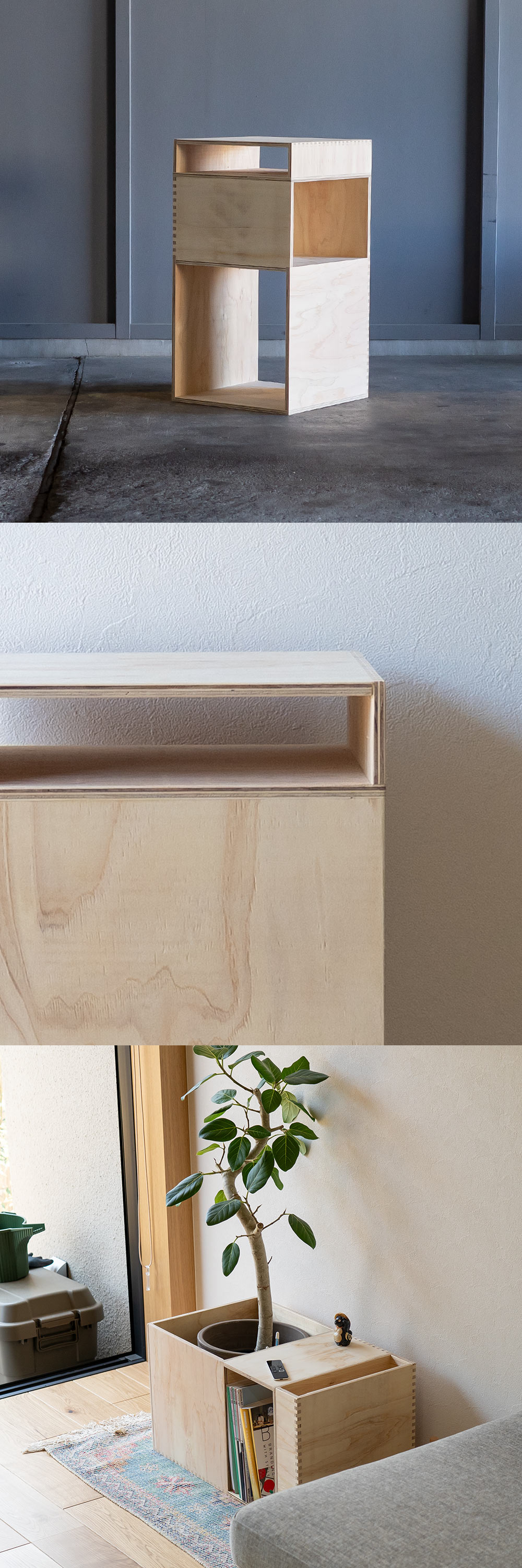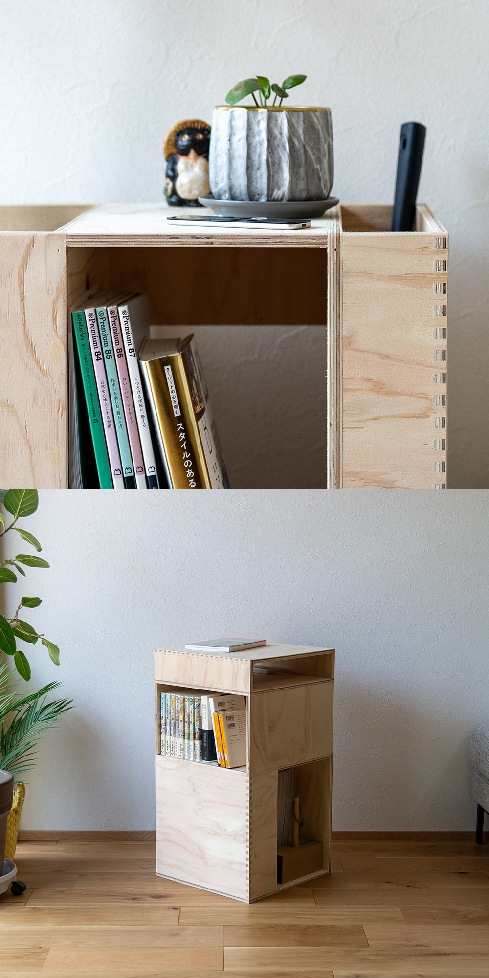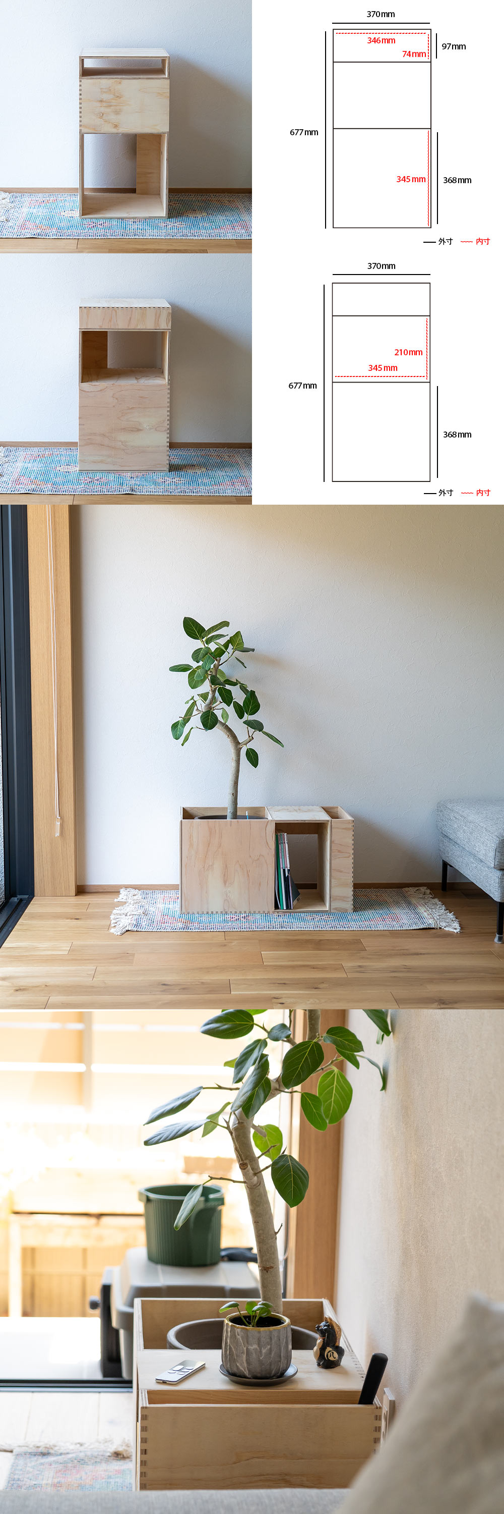 大きなスペースには、容量を活かして観葉植物やゴミ箱を入れ物ごと収めることができます。