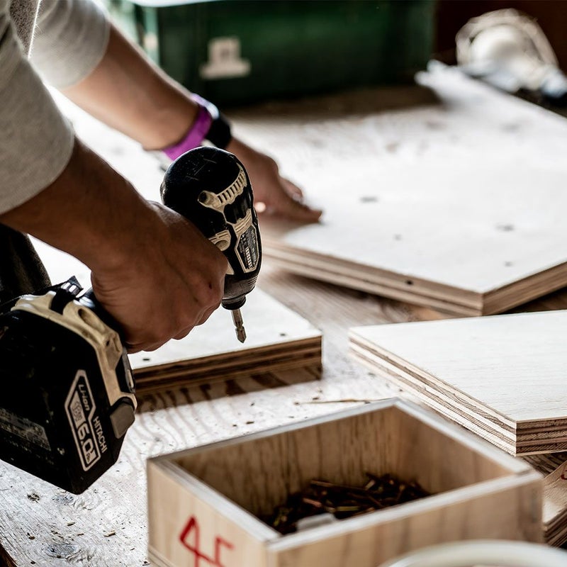枡と同じ木の組み方で、 木に細かな凸凹を付けて、パズルのように組み上げ製品を作ります。 寸分の狂いなく木を組むため強度も上がり変形しにくく、ビスやネジ跡もなく見た目が美しいのが特徴です。