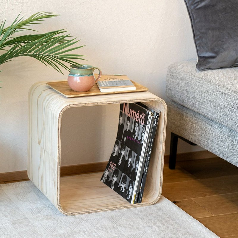 角がなく、手に触れるたびほっとするような安心感と、合板材のラフな木の質感はどんなインテリアにも自然に馴染みます。