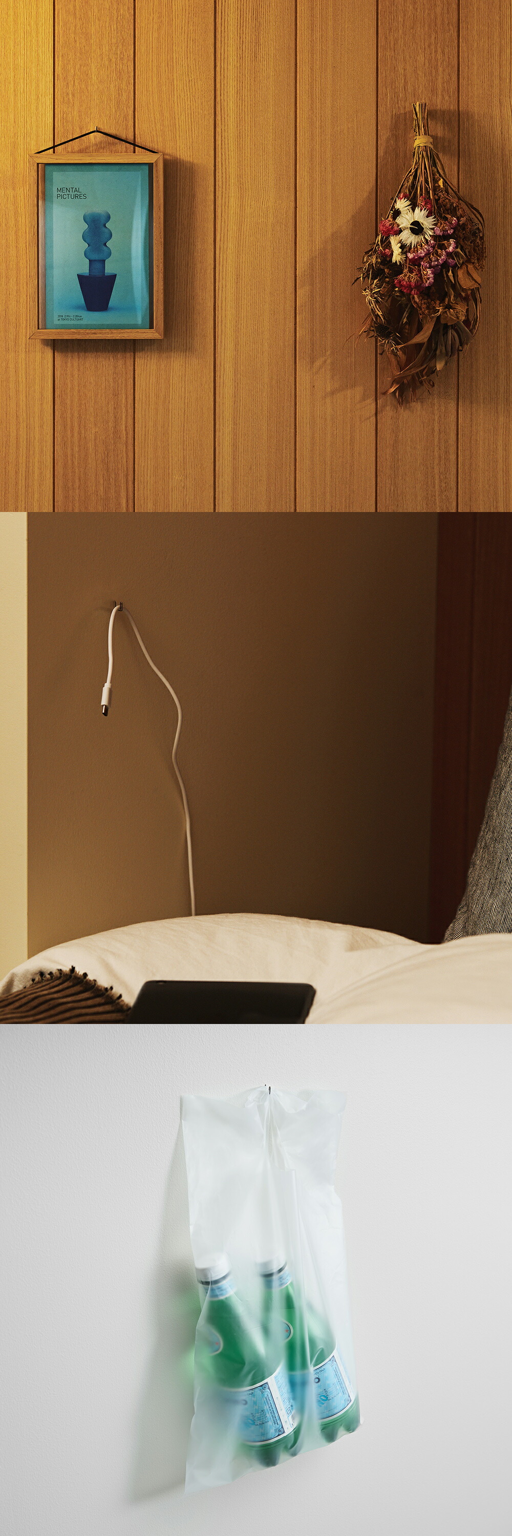 さらに、下に2本、上に1本使うことで、カードやリーフレットを穴をあけずに飾ることが可能。大切なメッセージや思い出の写真などを美しくディスプレイできます。
