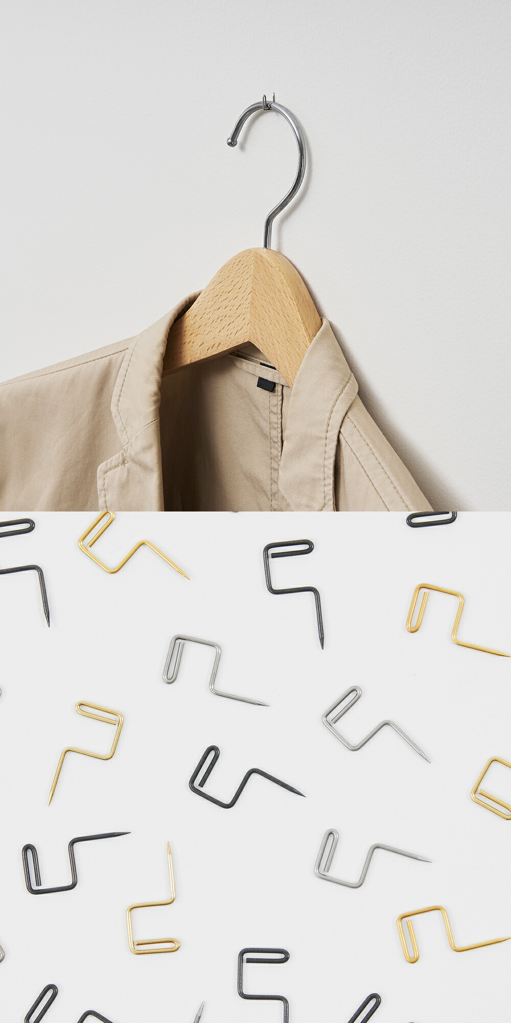 先端を折り返したデザインは、掛けたアイテムを傷つけにくく、万が一落としてしまったときも針が上を向かない構造で、日常の安全性にも配慮されています。