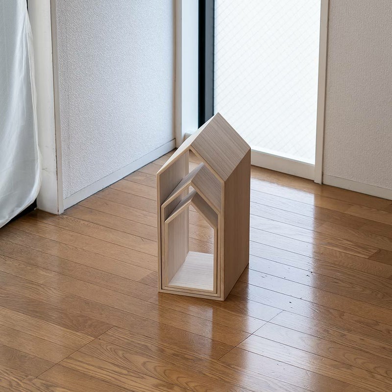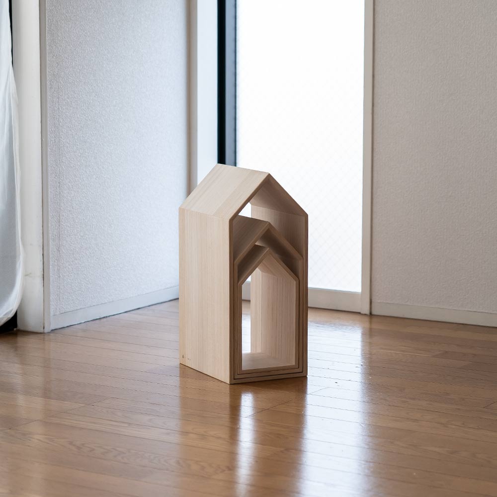 桐の特性でもある防虫性と調湿性を生かしたおうち型のブックスタンドシェルフです。