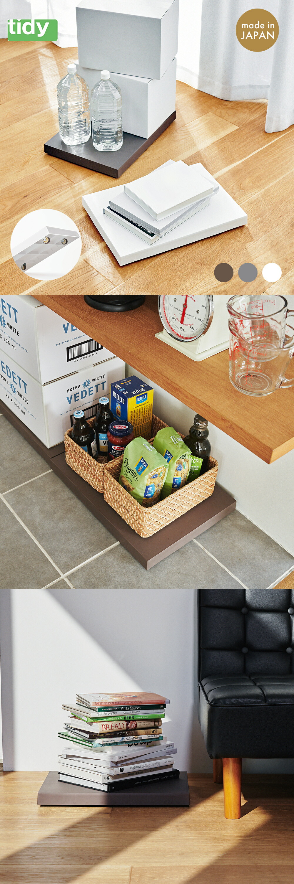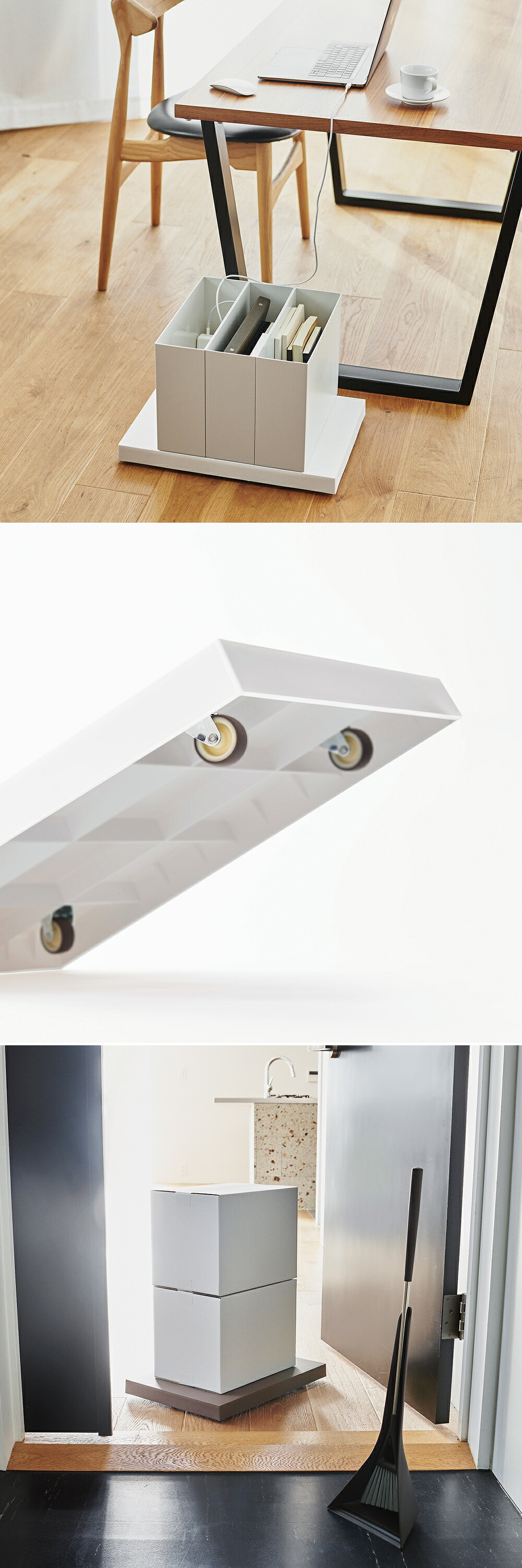ほんの少し動かしたい、そんな場面で活躍してくれる「動く台」。小さな台だけれど、その働きは想像以上です。複数並べてもすっきりと美しく、場所も選ばない。