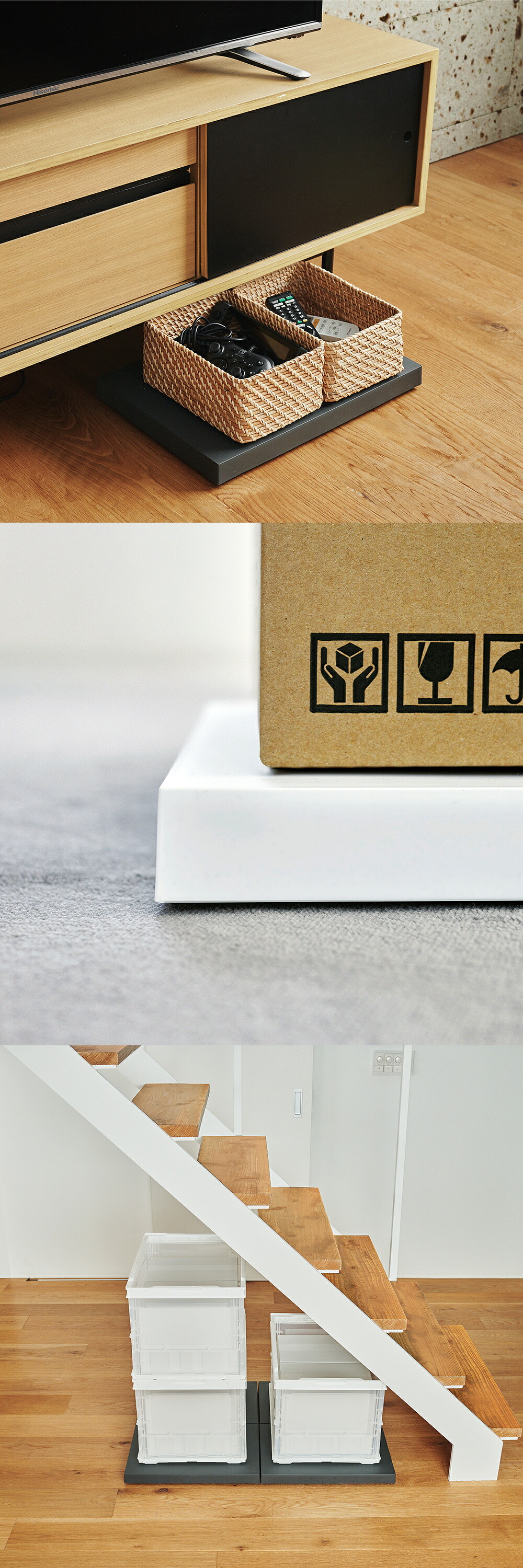 加湿器や空気清浄機、扇風機といった家電類も、掃除や模様替えのたびに持ち上げる必要がなくなります。複数台を並べて使えば、より大きなアイテムにも対応可能。