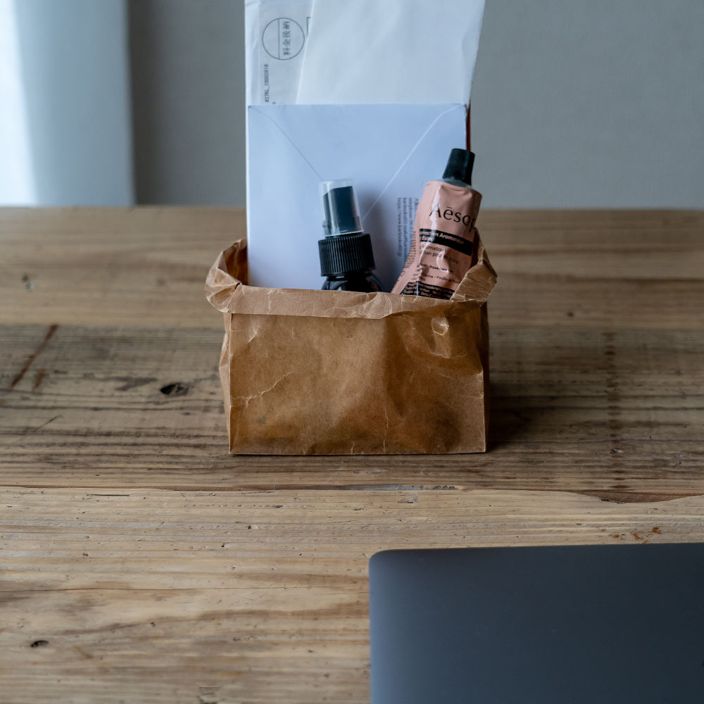 細々とした物の小分け整理に、卓上サイズの小さなダストボックスとして。 お好みで縁を折り返したり、あえてシワを付ける事で質感も変わり、見せる収納にもおすすめです。
