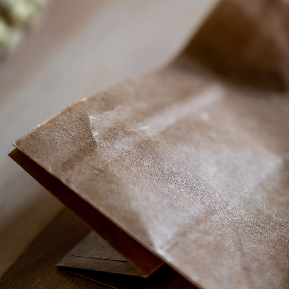 食品包装用としてご利用頂ける安全な紙袋です。耐水性があり水に濡れたり、氷の上に置いていても破れにくく仕様です。通気性もあるので、鮮魚店や惣菜店などで永く使われてきました。米袋にも使用される強度のある「重包装紙」を使用し、見落とされがちな糊も含め、紙・蝋につきましても公的機関において食品包装用として規格試験を通過した原材料を使用。昭和20年から続く小さな町工場で作られています。