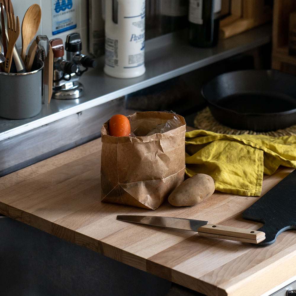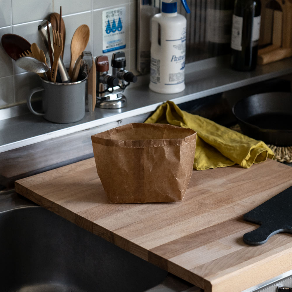 キッチンで根菜や食品の保管袋や日常の小物入れとして、鉢カバーにもお使いいただけます。 底が舟形で使いやすく、お好みで縁を折り返したり、あえてシワを付ける事で質感も変わり、見せる収納にもおすすめです。