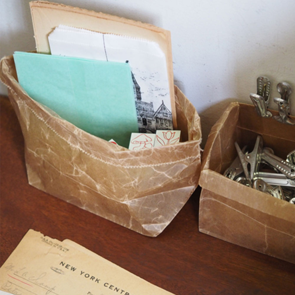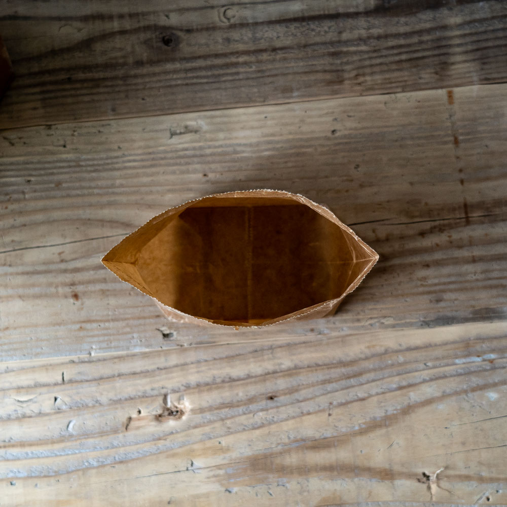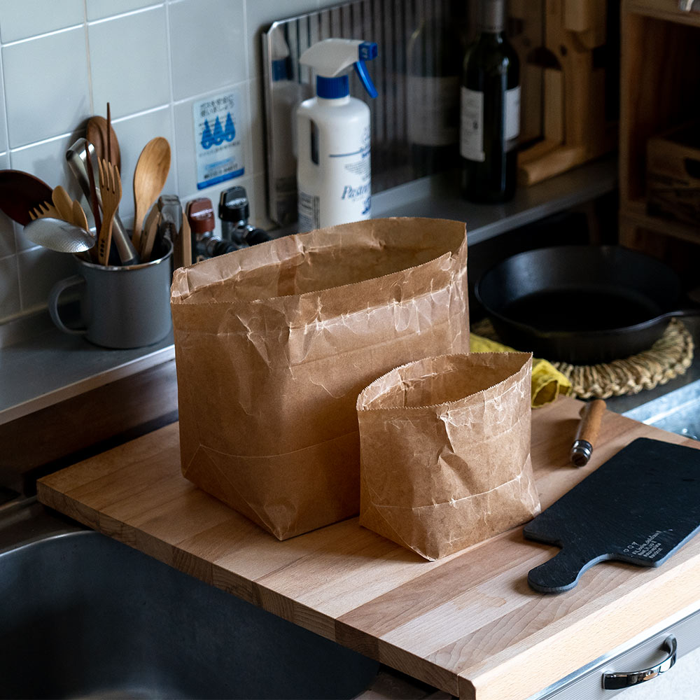 食品包装用としてご利用頂ける安全な紙袋です。耐水性があり水に濡れたり、氷の上に置いていても破れにくく仕様です。通気性もあるので、鮮魚店や惣菜店などで永く使われてきました。米袋にも使用される強度のある「重包装紙」を使用し、見落とされがちな糊も含め、紙・蝋につきましても公的機関において食品包装用として規格試験を通過した原材料を使用。昭和20年から続く小さな町工場で作られています。