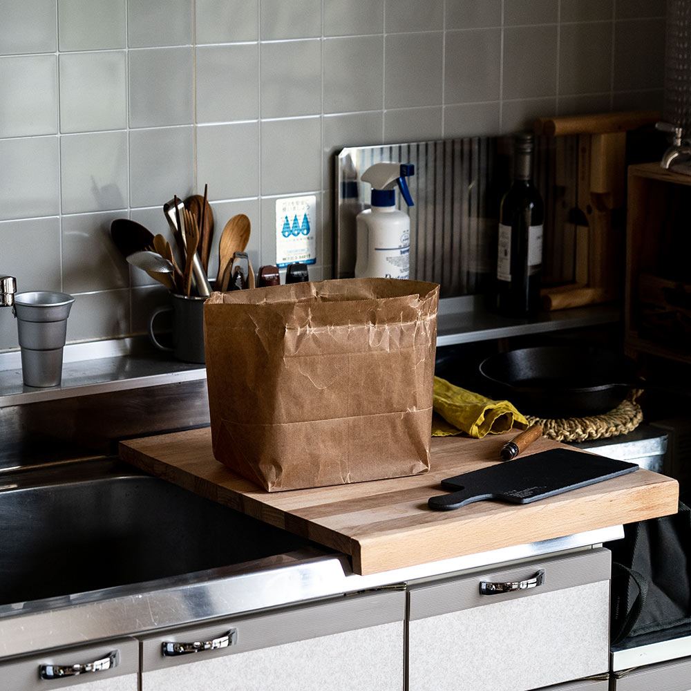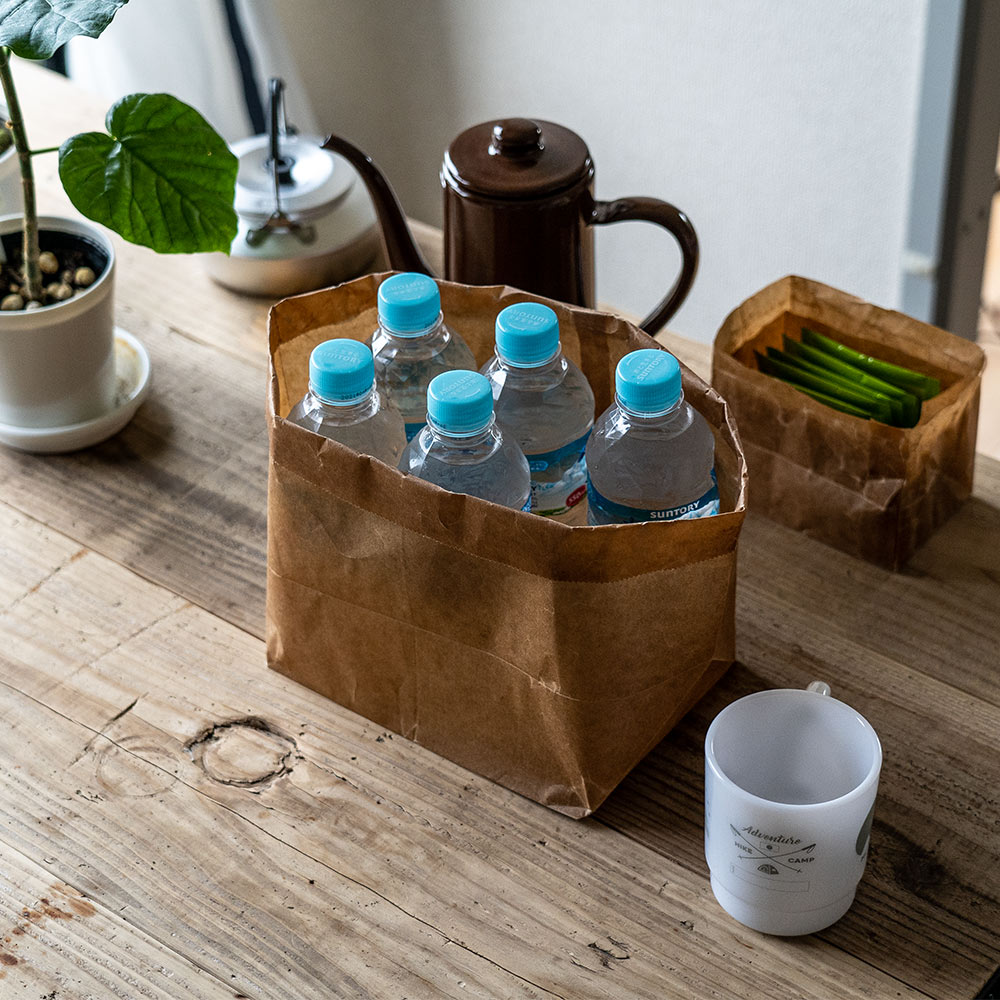 キッチンで根菜や食品の保管袋に、500mlペットボトルがちょうど6本入ります。 日常の小物入れとして、鉢カバーにもお使いいただけます。 底が舟形で使いやすく、お好みで縁を折り返したり、あえてシワを付ける事で質感も変わり、見せる収納にもおすすめです。