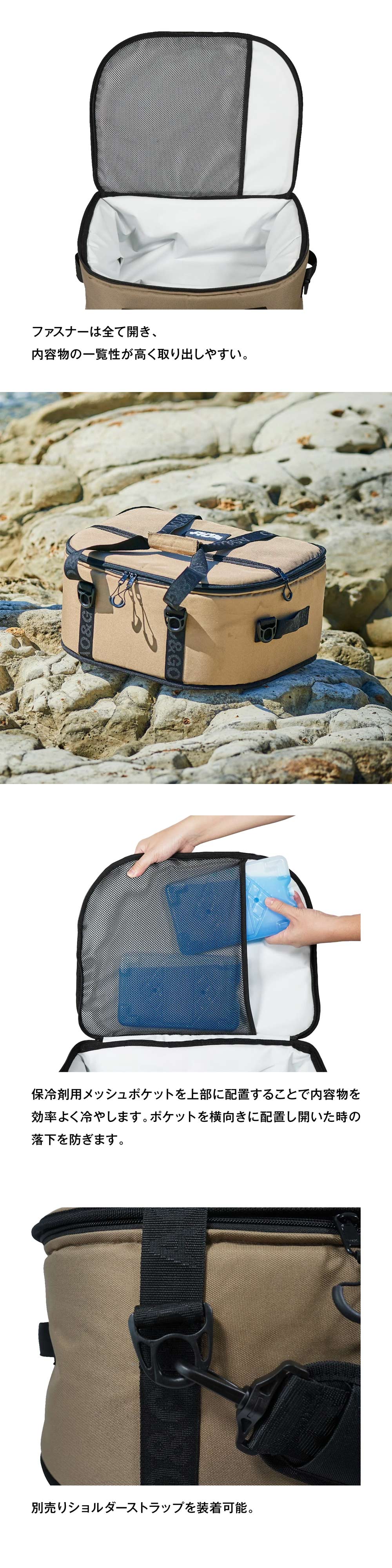 ・保冷剤メッシュポケットを上部に配置することにより、内容物を効率よく冷却。