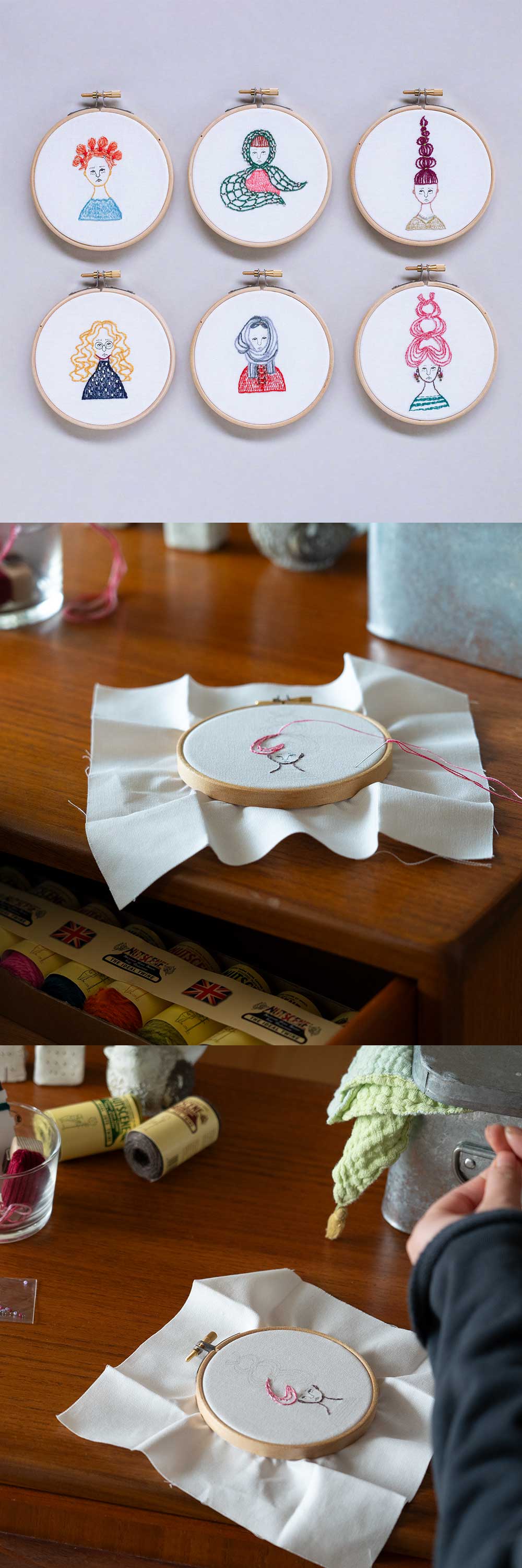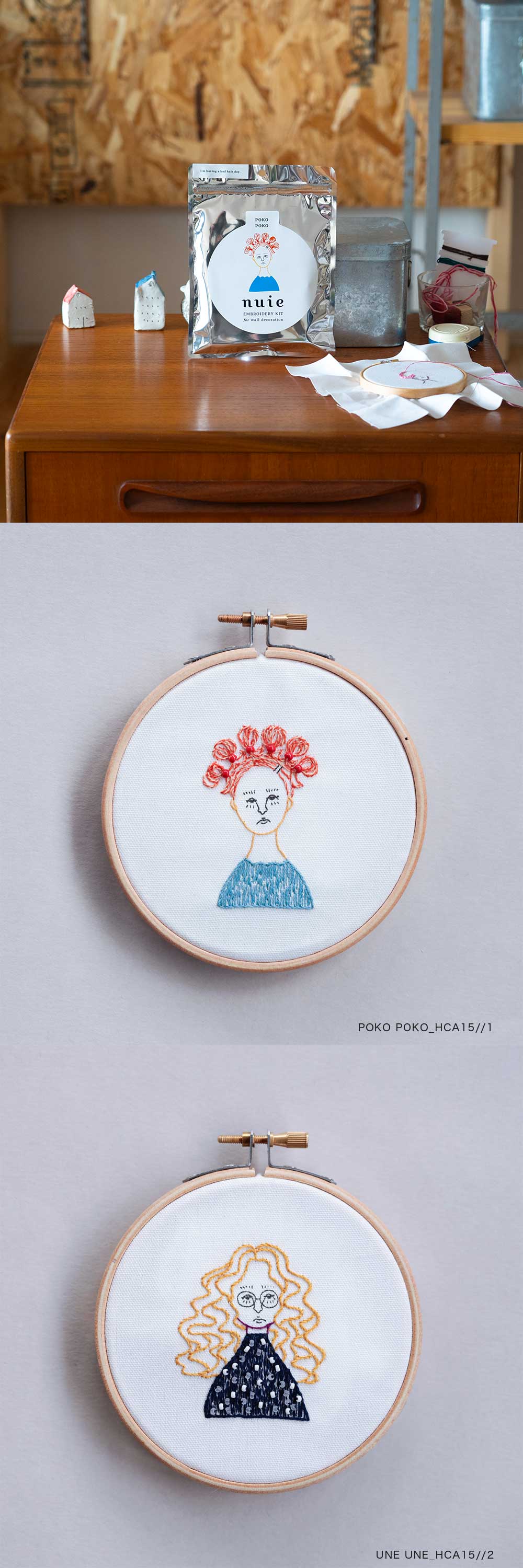 絵を描くように刺しゅうをたのしむ「nuie(ヌイエ)」シリーズの第 1 弾は、『髪がきまらない』。なんともいえない表情の、個性豊かな悩める 6 人の女の子たちです。