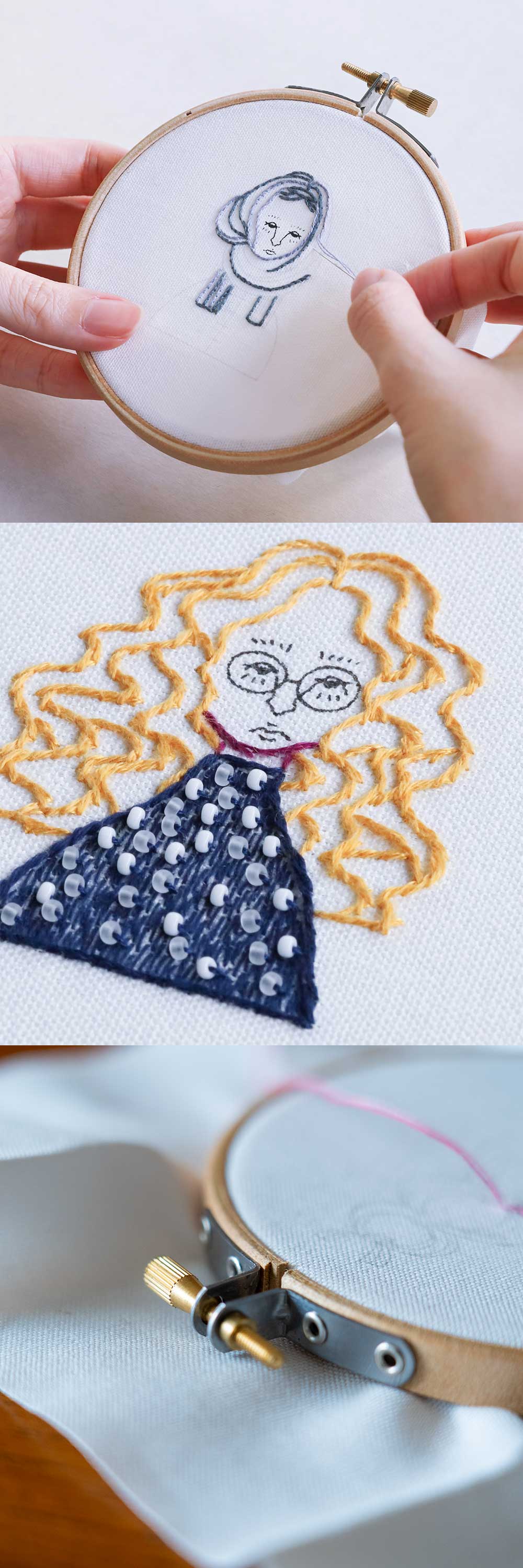 簡単なステッチで絵を描くようにつくる、糸とビーズの刺しゅうキット。