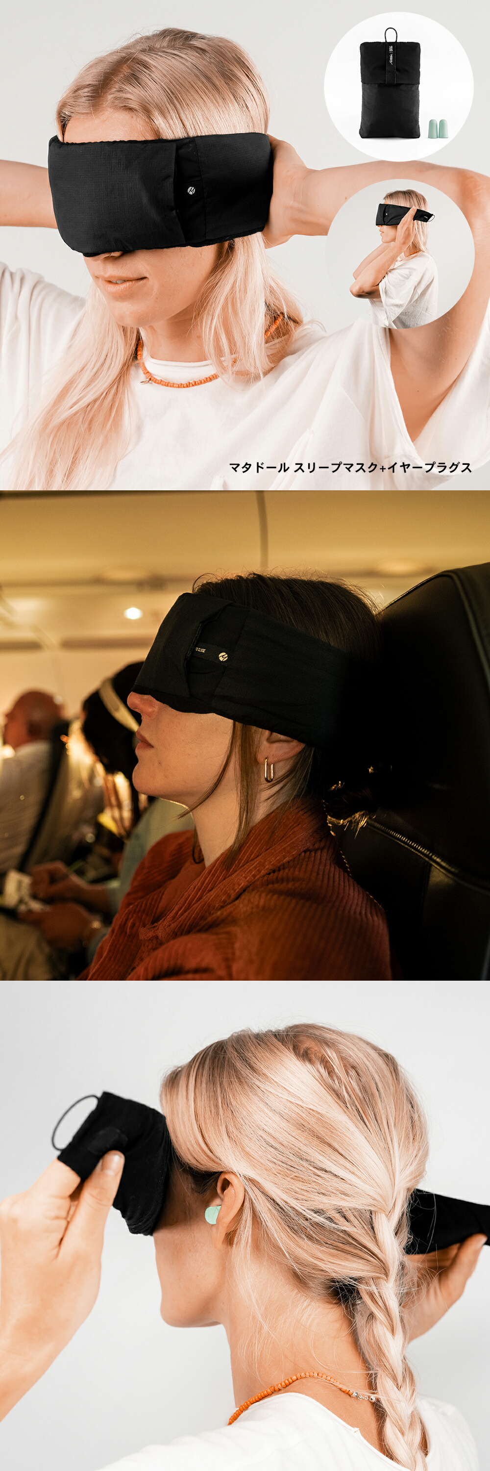 機内や電車移動での快眠を得るために、あなたは何をしていますか?睡眠環境を整える、スタイリッシュで機能的なスリープマスクと耳栓セットです。