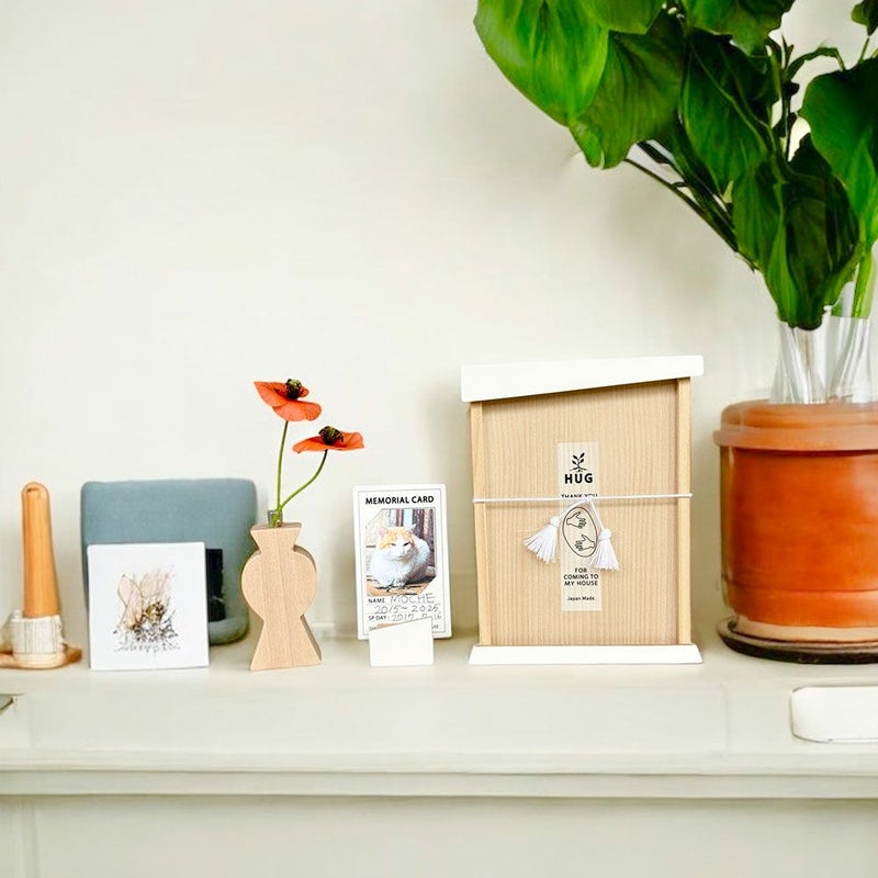 ペットのお写真やメモリアルカードを立てて飾れるスタンド付き。