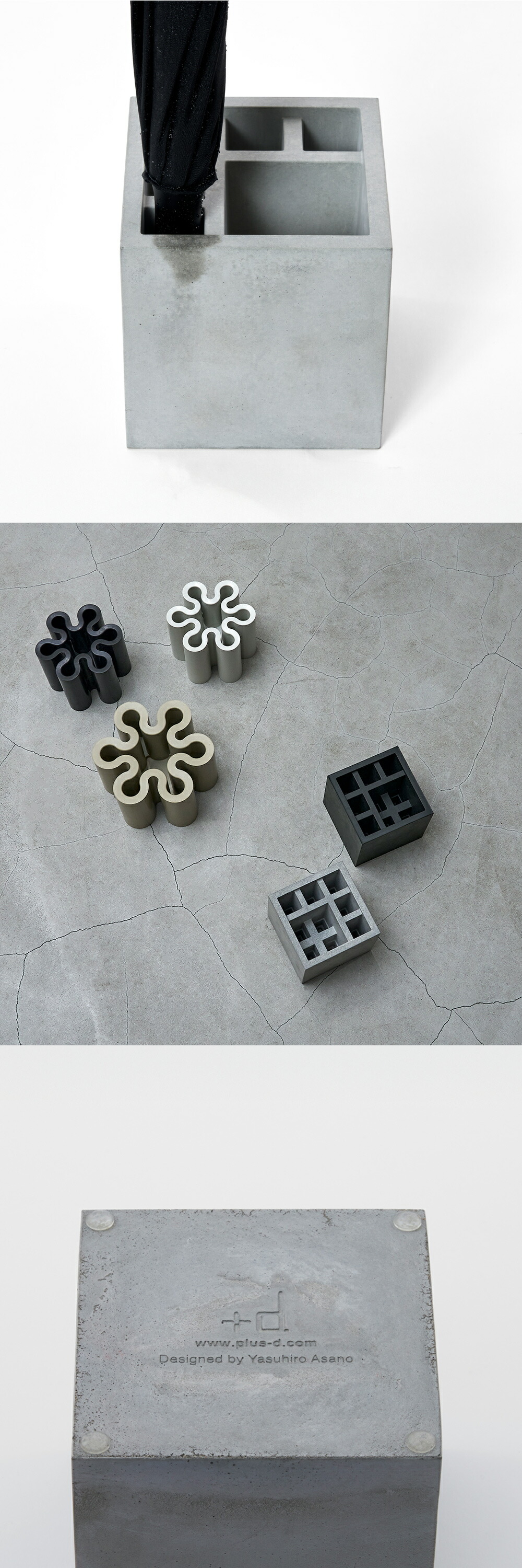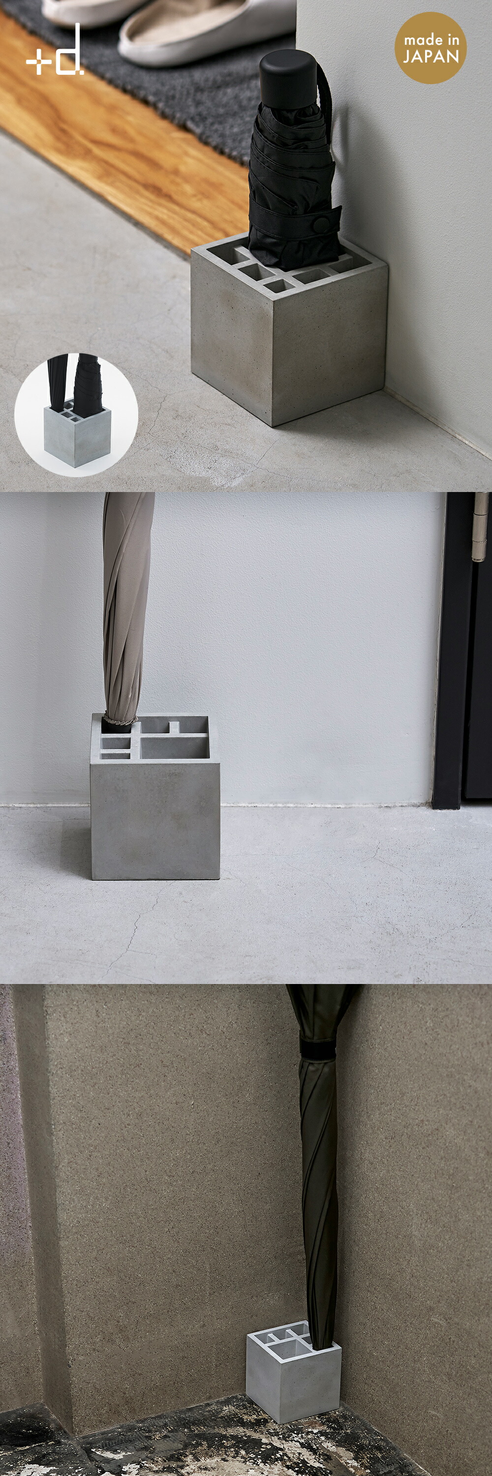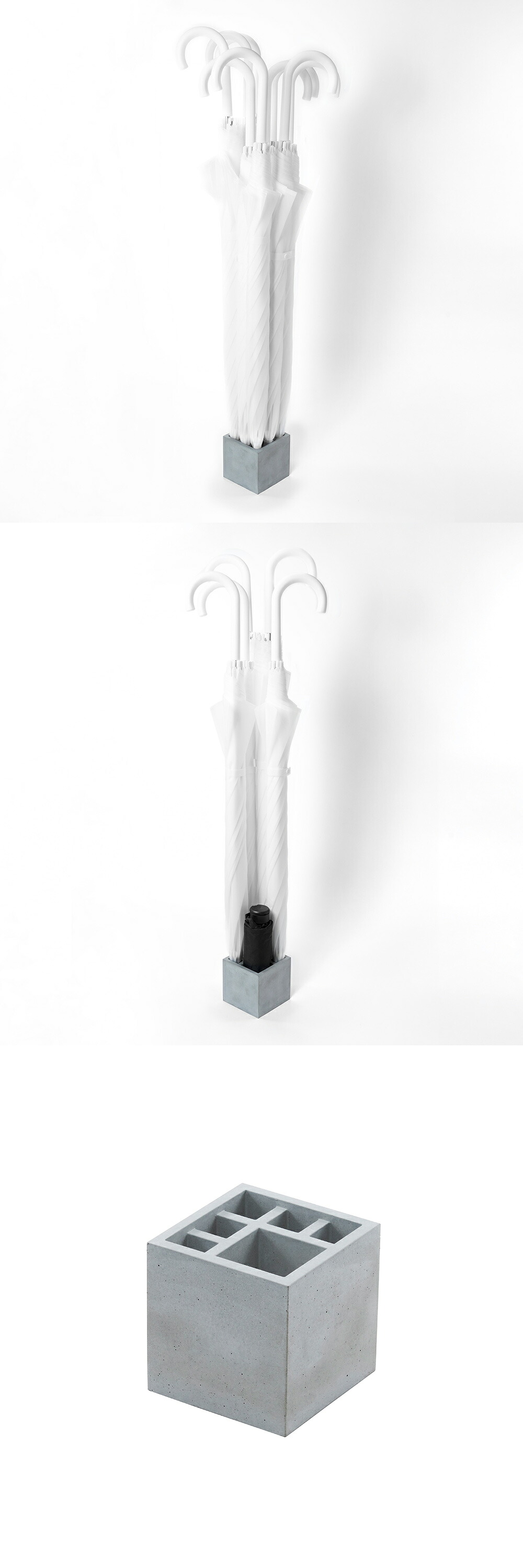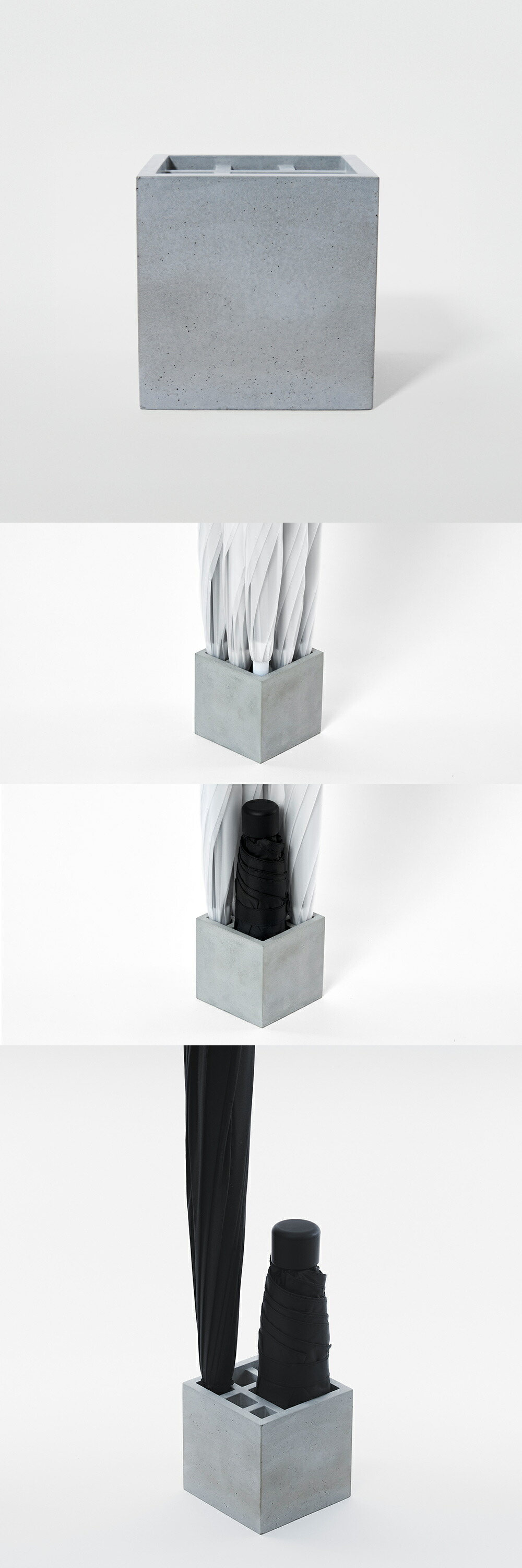 無駄をそぎ落としたデザインと、モルタルの素朴で静かな佇まいが、空間に心地よく馴染みます。長傘も折りたたみ傘も美しく収まり、使わない時もインテリアの一部として成立する、そんな傘立てです。