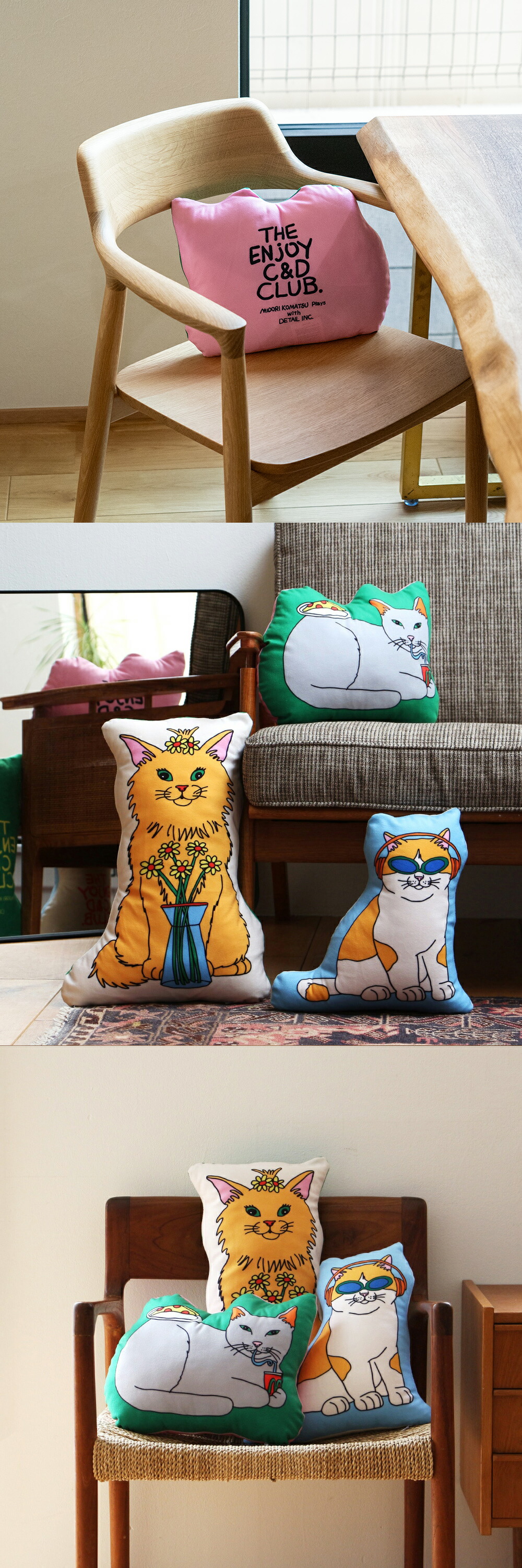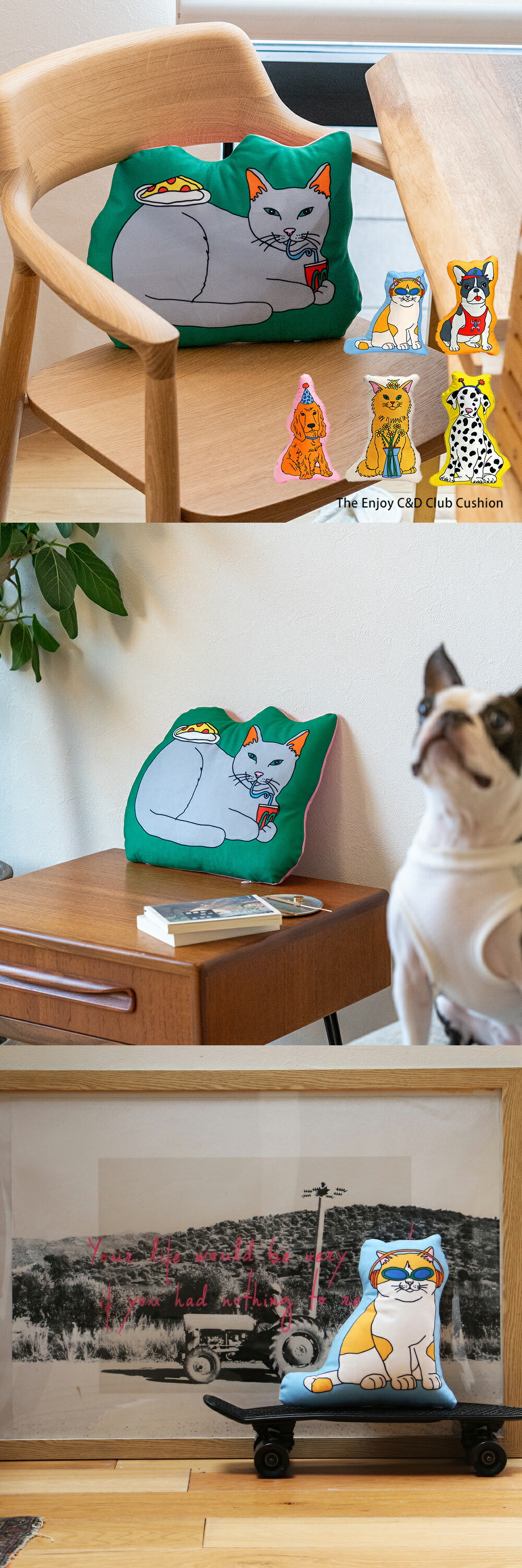日々を楽しんでいるペット達をテーマにした、イラストレーターMIDORI KOMATSUデザインのクッション。