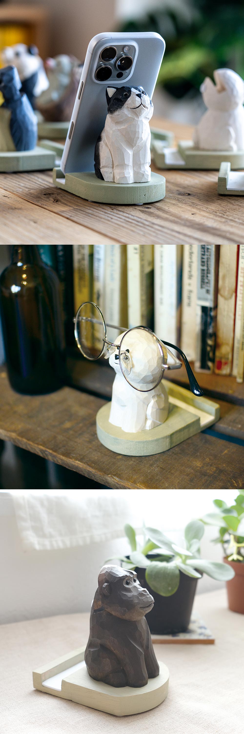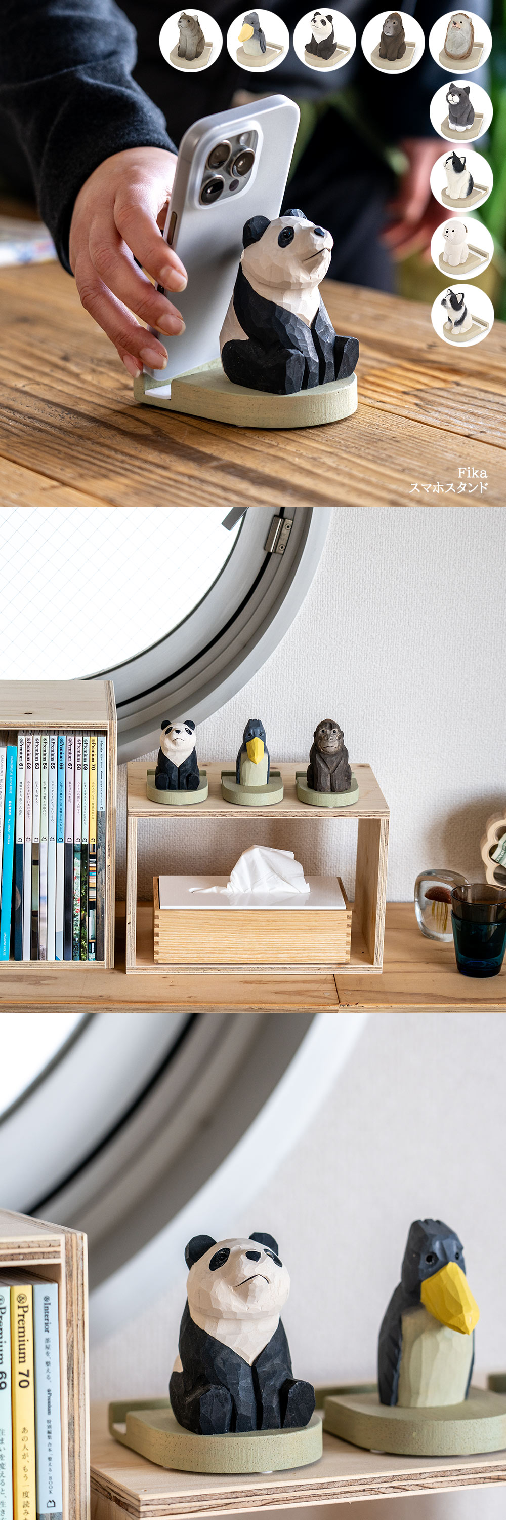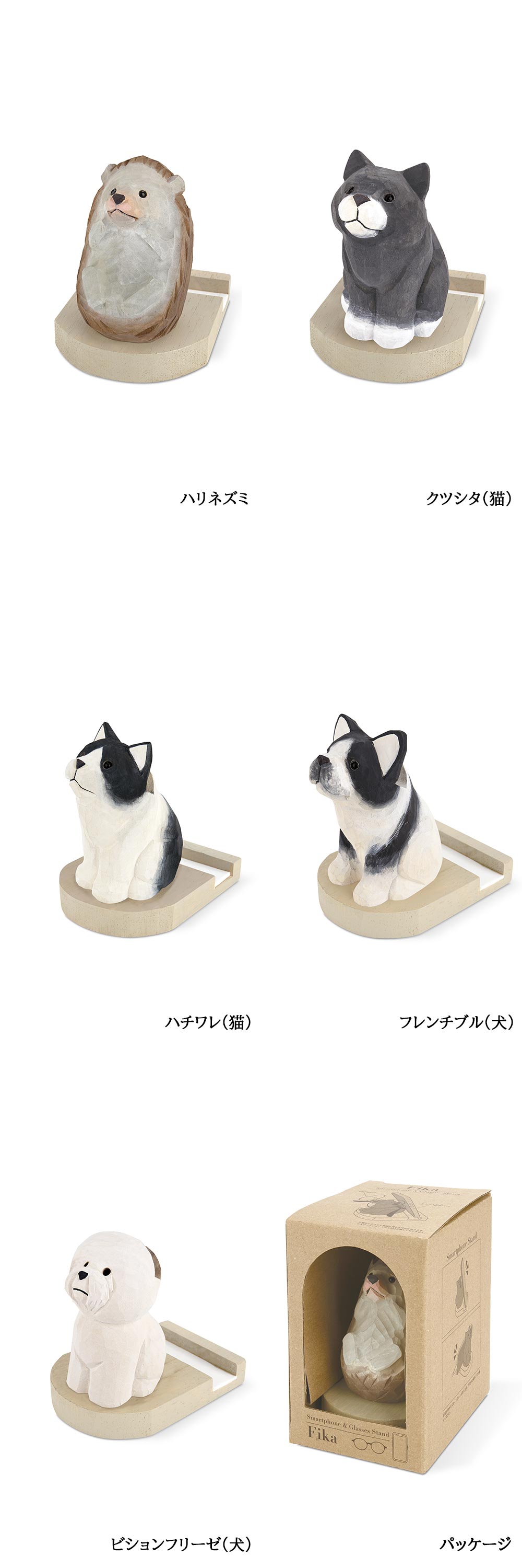 スマホと眼鏡をしっかり支える、やさしい表情の木彫りアニマルたち 株式会社キシマ|Fika スマホスタンド