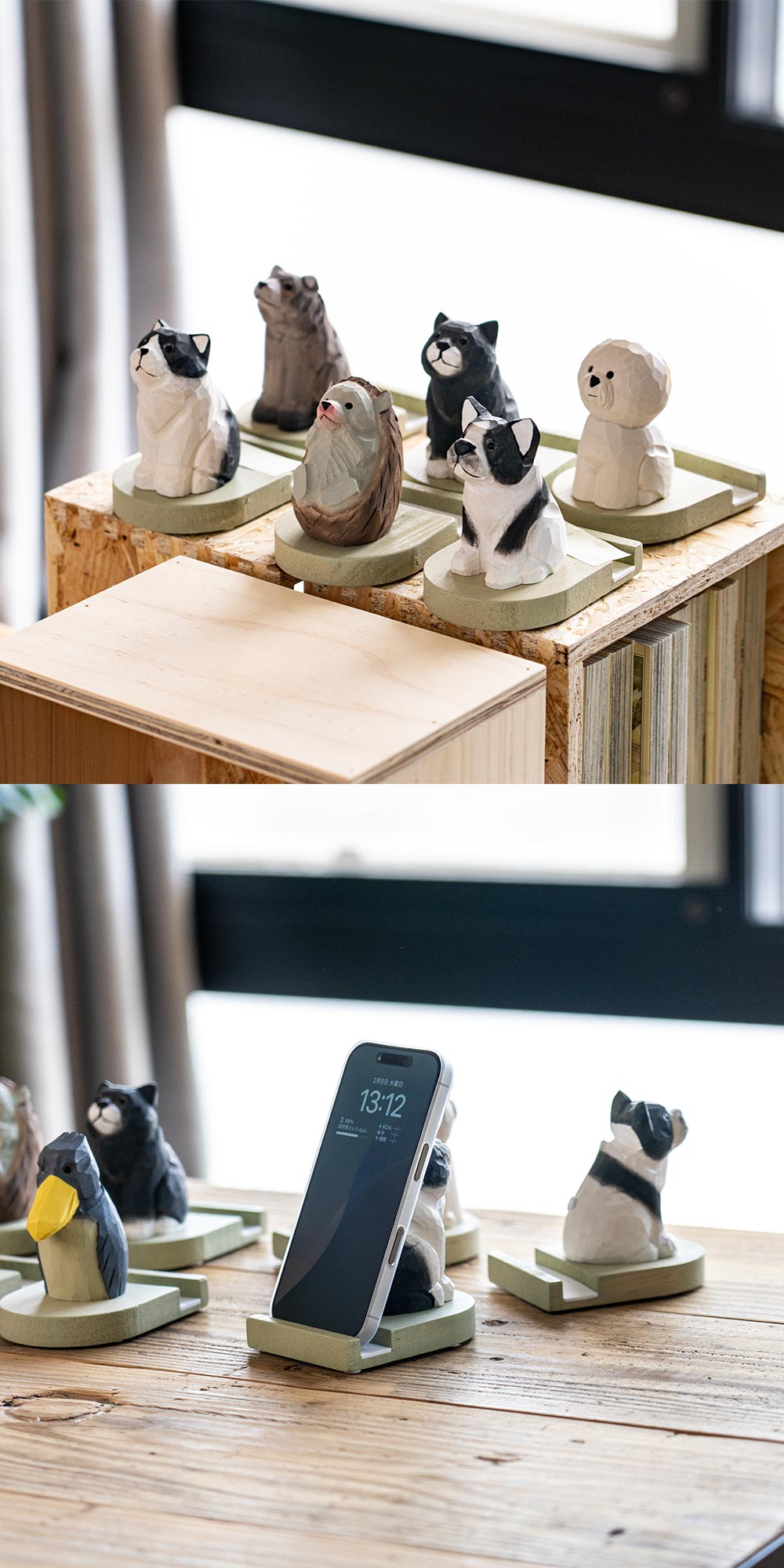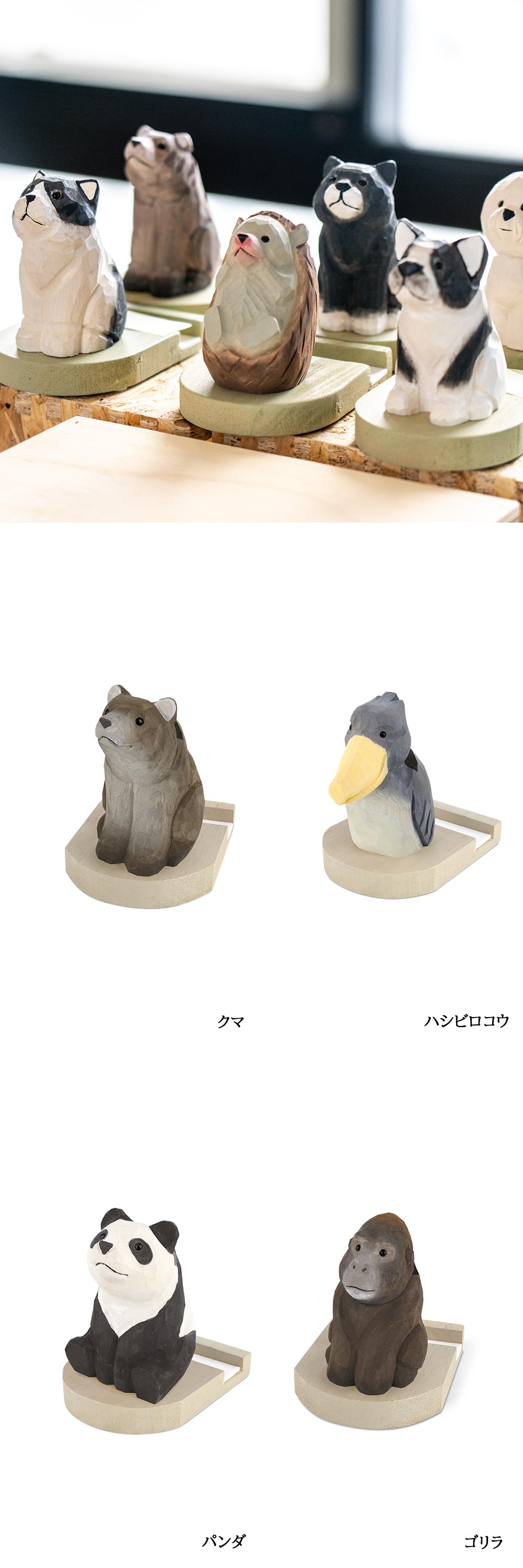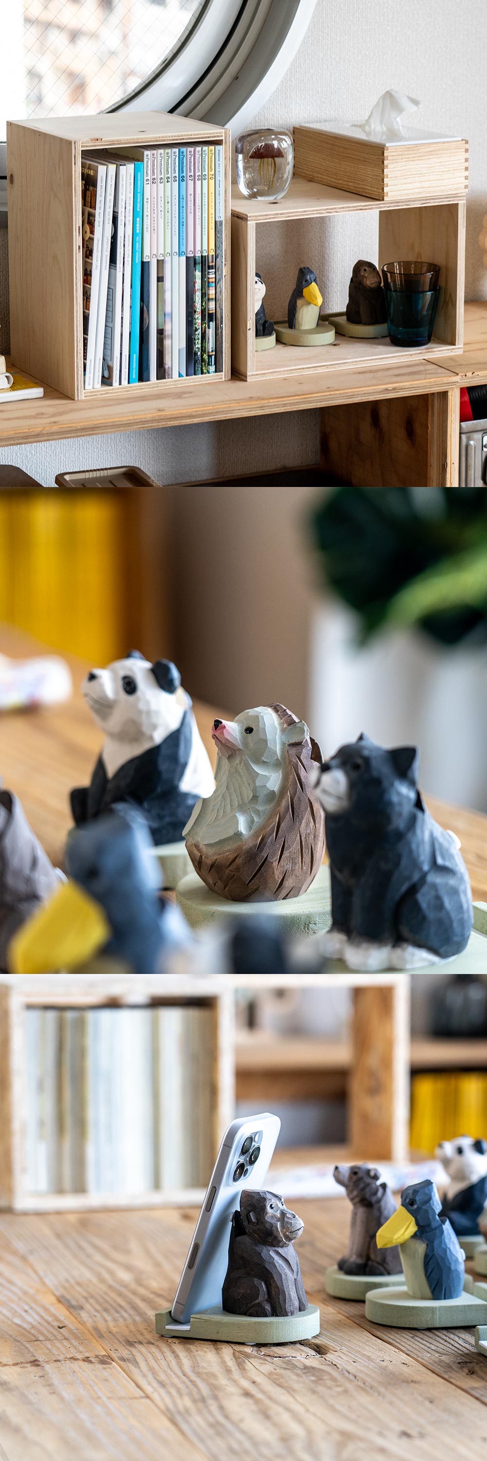 スマホと眼鏡をしっかり支える、やさしい表情の木彫りアニマルたち 株式会社キシマ|Fika スマホスタンド