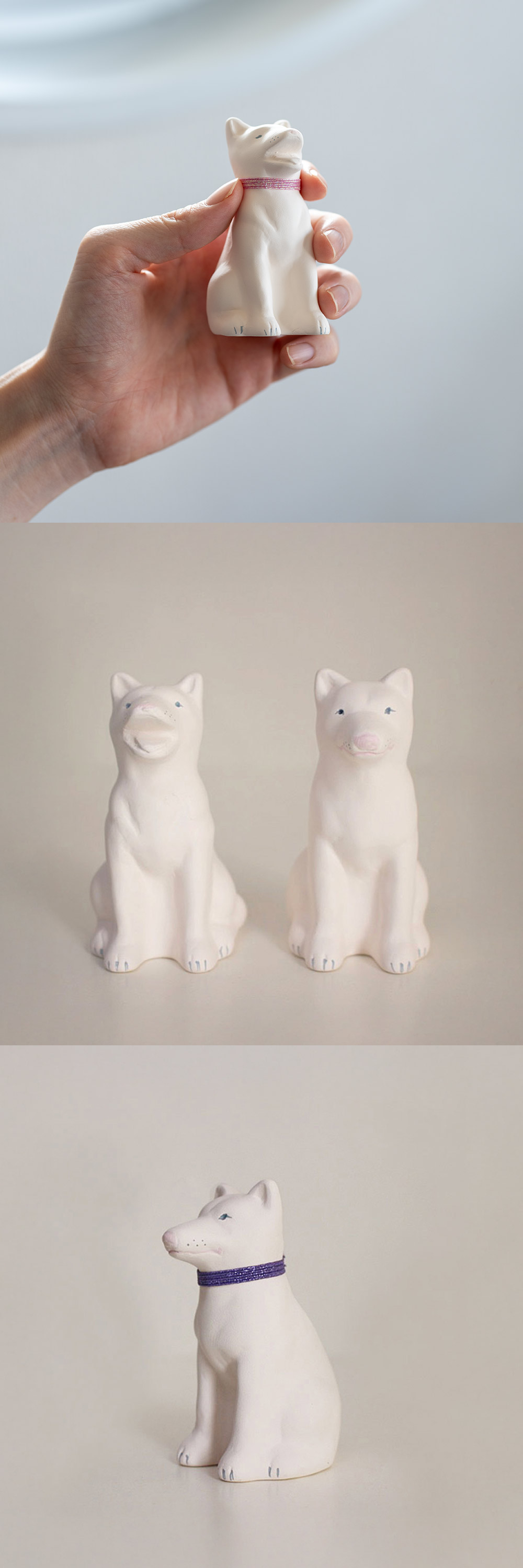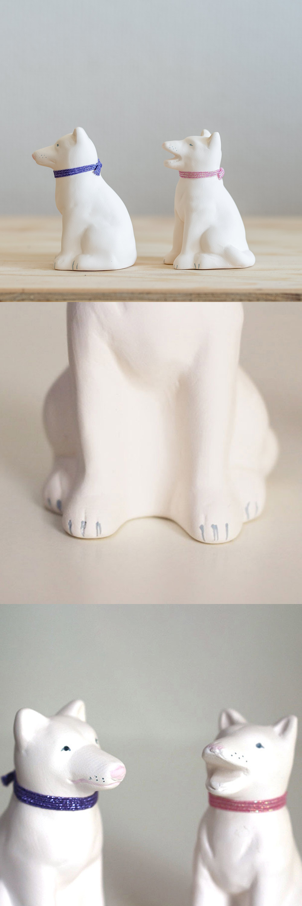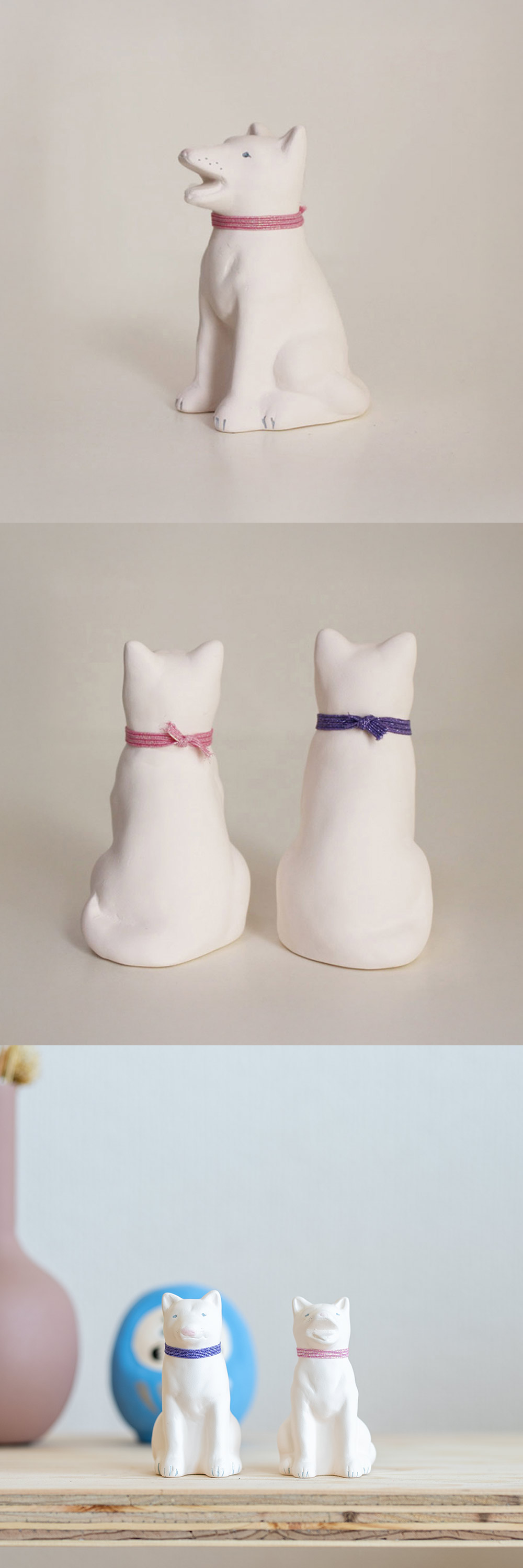 ちょっとファンキーな首輪はゴム製で取り外しできます。そのままお飾りいただいてもよし、お好きな紐にお取替えいただいてもよし。素焼きの磁器でできているので、自由に色が塗れ、お絵描きができます。 わんこLOVEさんだけでなく、ちょっと素直な味方が欲しくなったときなどに、是非どうぞ。