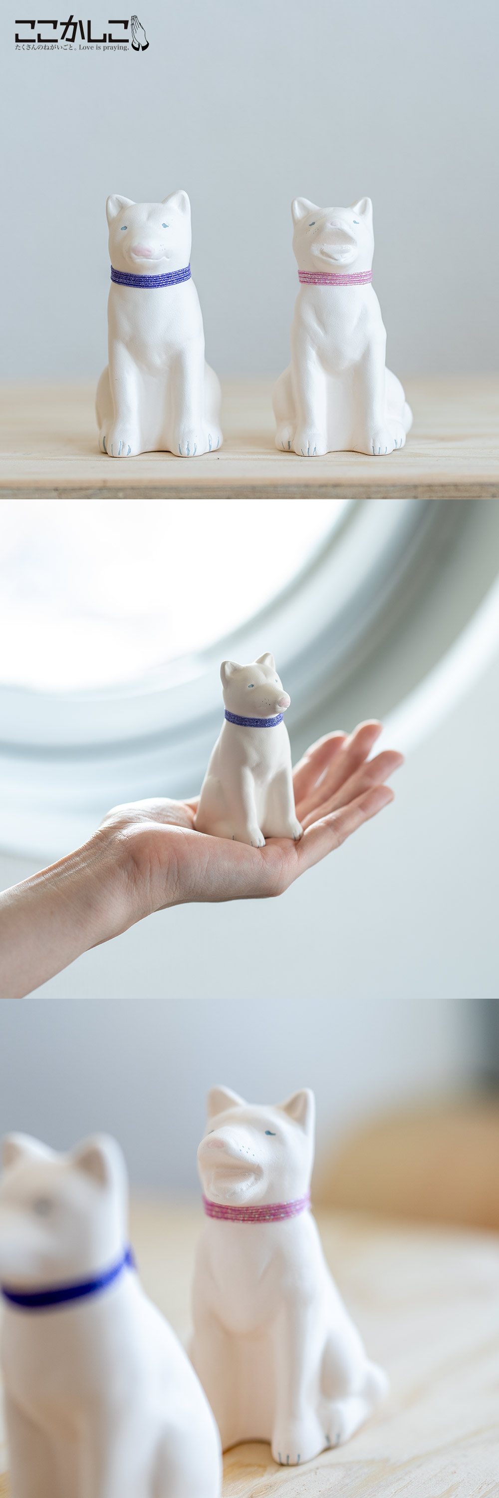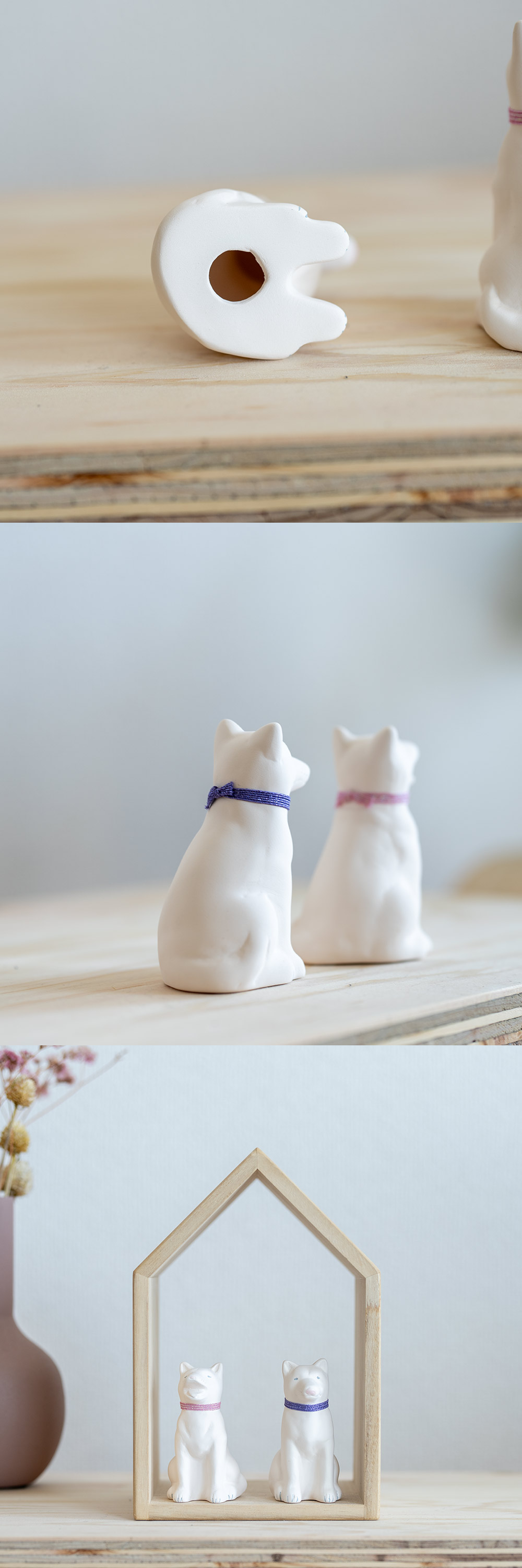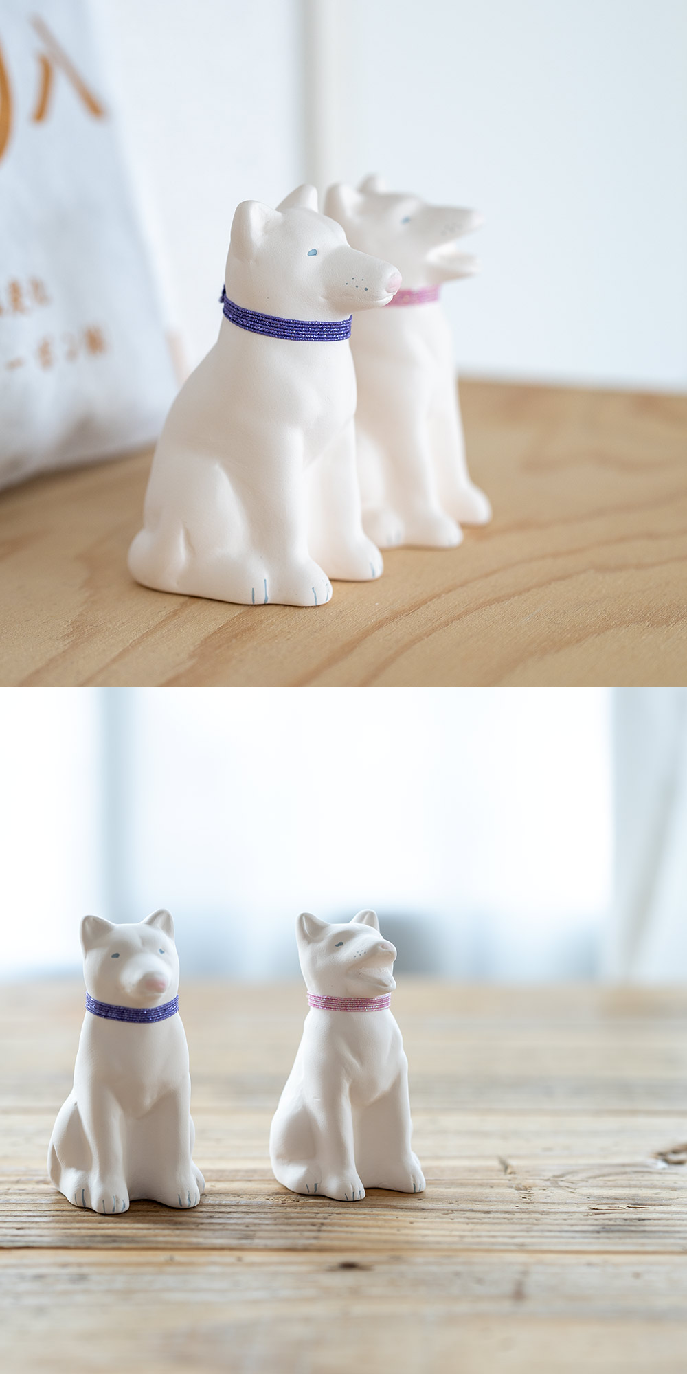ちょっとファンキーな首輪はゴム製で取り外しできます。そのままお飾りいただいてもよし、お好きな紐にお取替えいただいてもよし。素焼きの磁器でできているので、自由に色が塗れ、お絵描きができます。 わんこLOVEさんだけでなく、ちょっと素直な味方が欲しくなったときなどに、是非どうぞ。