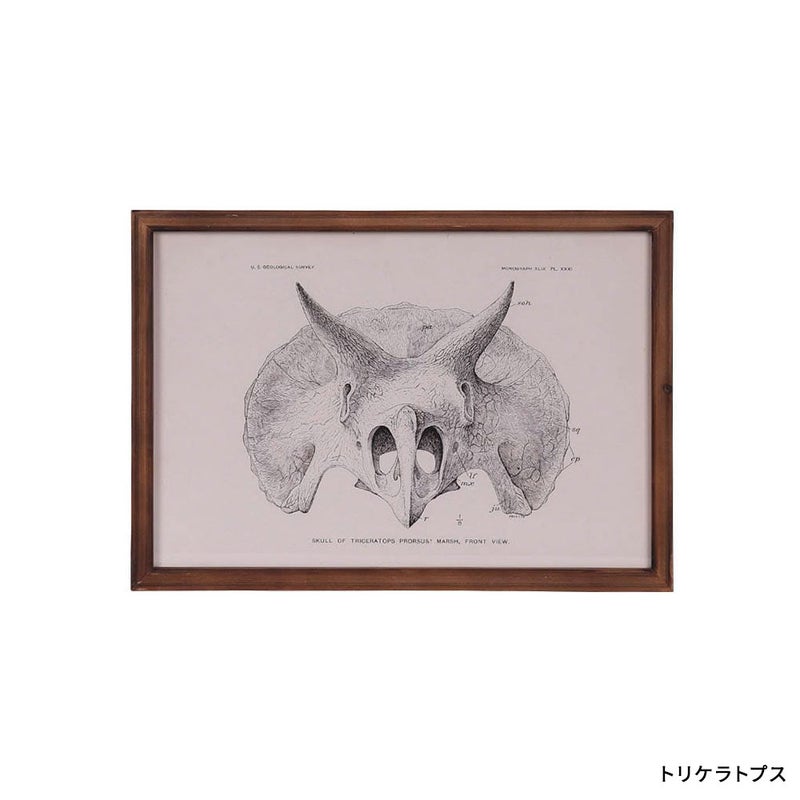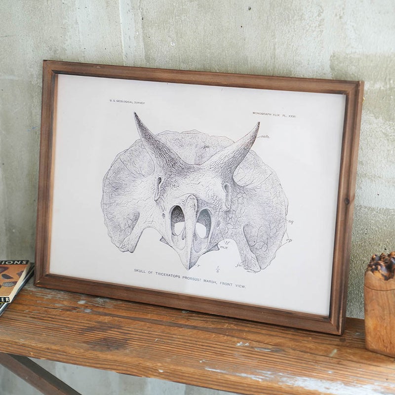「3本の角を持つ顔」を意味するトリケラトプスの、力強くも美しい骨格図をアートフレームに。