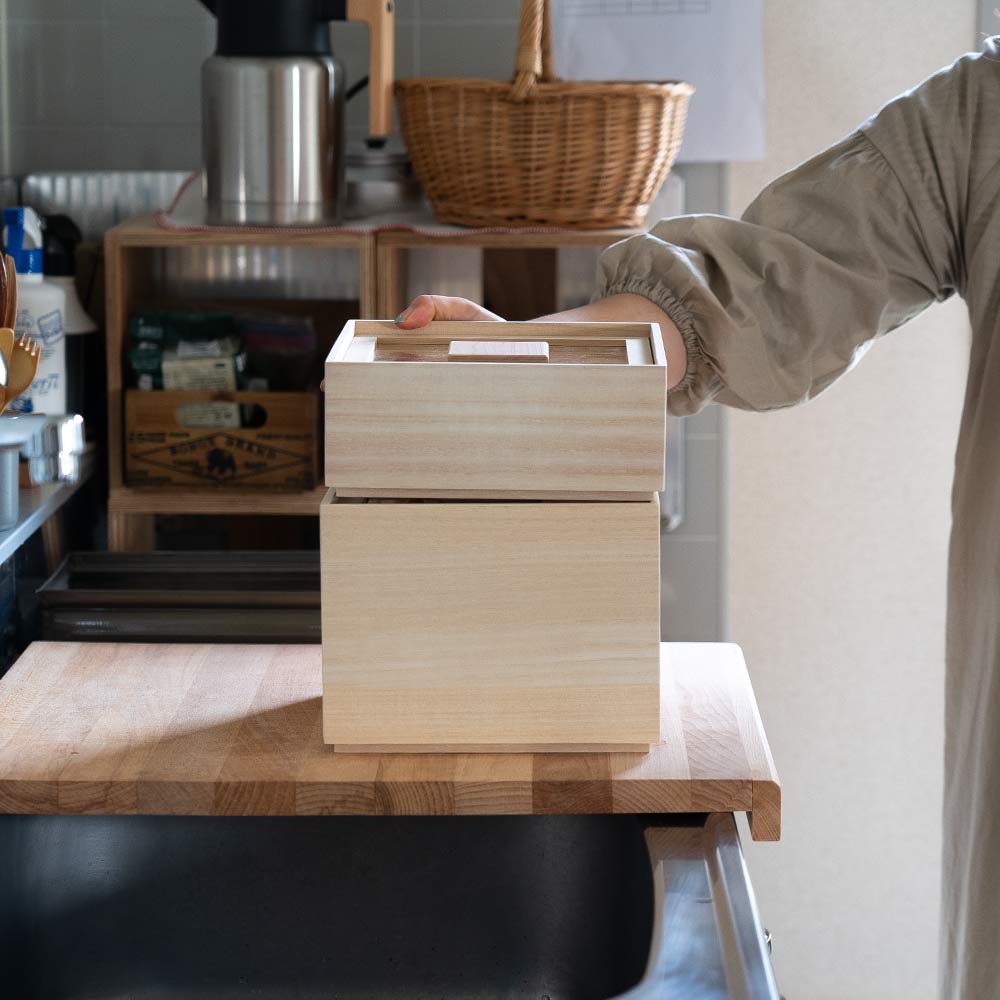 創業90年を迎える増田桐箱店の新プロジェクトブランド「kiribako」の米びつ。