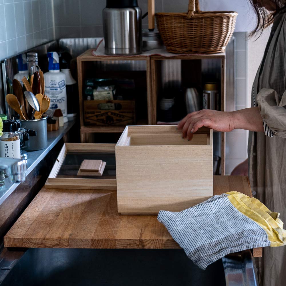 桐独特の優しい風合いとシンプルですっきとしたデザインは見た目にも美しく、キッチンで視界に入る場所に置く事をオススメいたします。
