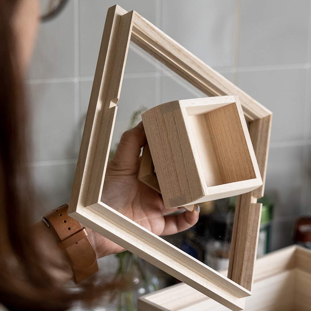 ・中身が確認しやすいように、蓋を透明度の高いアクリルと四方桟という桐箱伝統の技術を組み合わせたものを独自に開発。