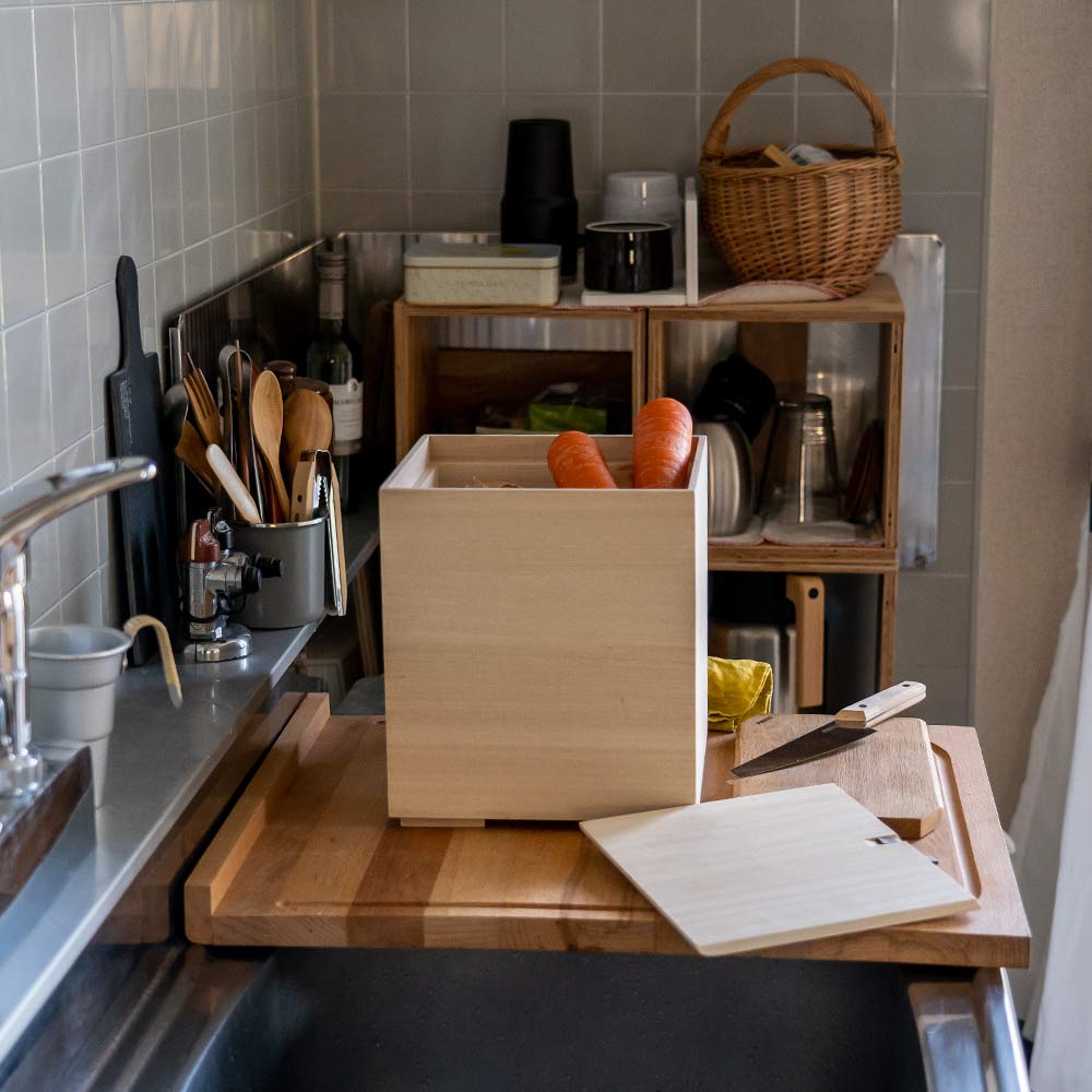 桐のもつ調湿性と防虫効果が野菜の鮮度を保ち、内部のスノコ底と蓋部分の隙間と合わせて空気の流れを生むため、多湿環境になりにくい構造になっています。 Sサイズは増田桐箱店の米びつ3kg、Lサイズは米びつ5kgと寸法規格が同じなのでお互いに重ねることができますし、並べて収納した場合、キッチンキャニスターとしての美しい一体感が生まれます。 目的や保存する野菜の種類に応じて使い分けられるよう2サイズの展開を行っています。